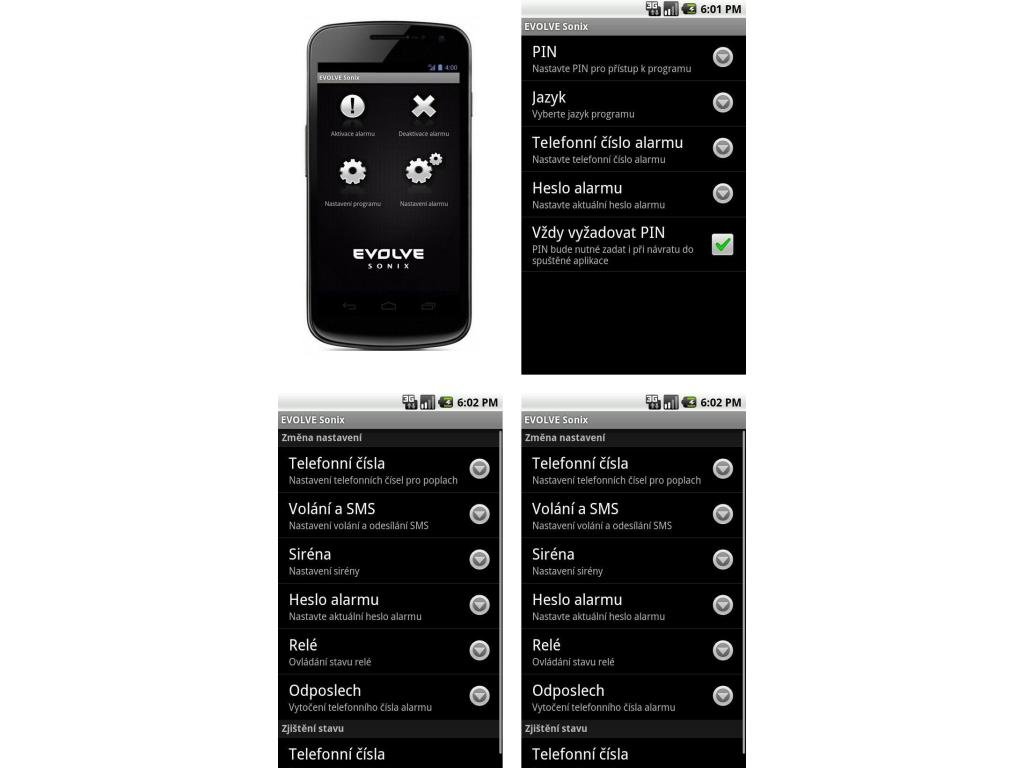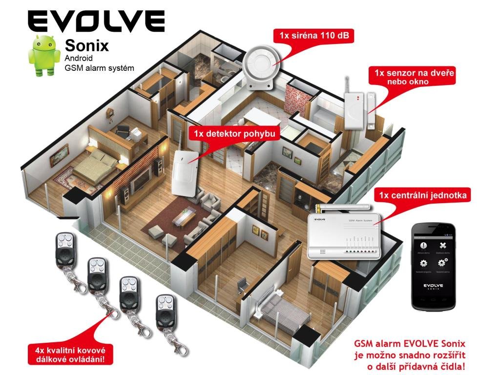 S pomocí aplikace EVOLVEO Sonix můžete pohodlně obsluhovat celý systém, snadným zadáváním povelů na dotykovém displeji vašeho telefonu, dostupné v Google Play. Tato aplikace pro Android je pouze komfortním doplňkem, hlavním ovládacím prvkem je kovový dálkový ovladač, který je součástí balení alarmu.