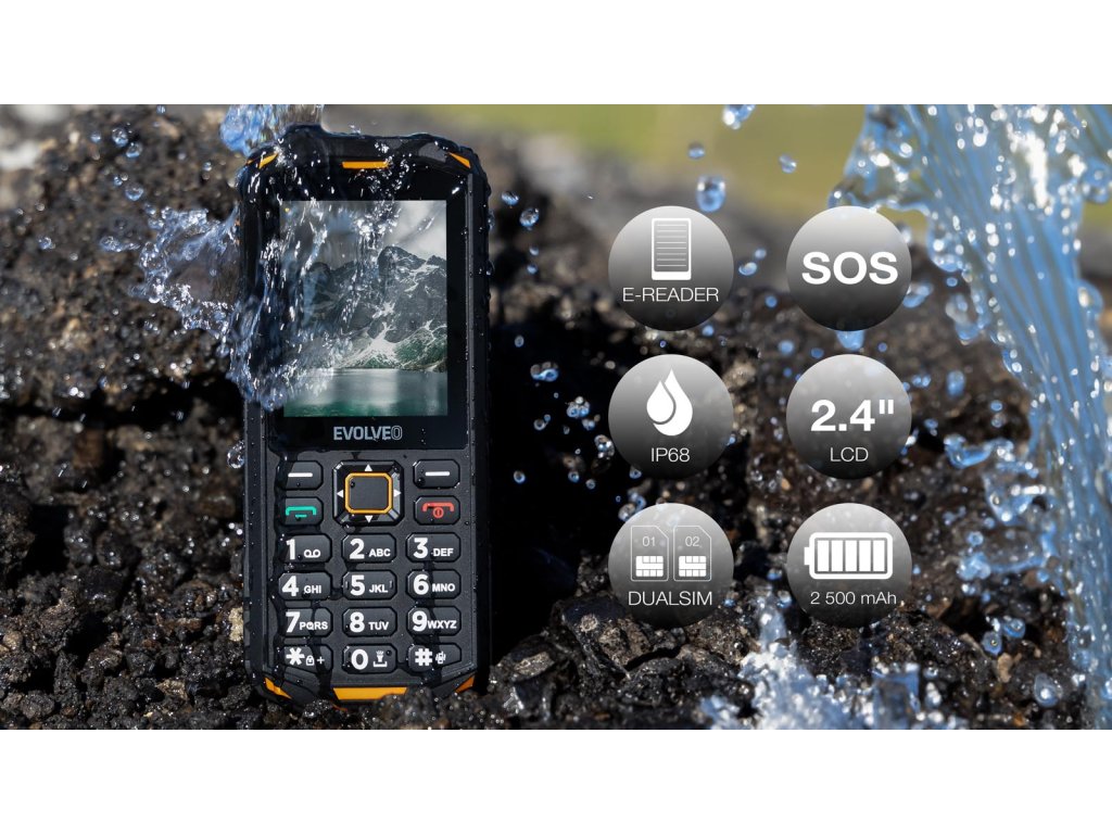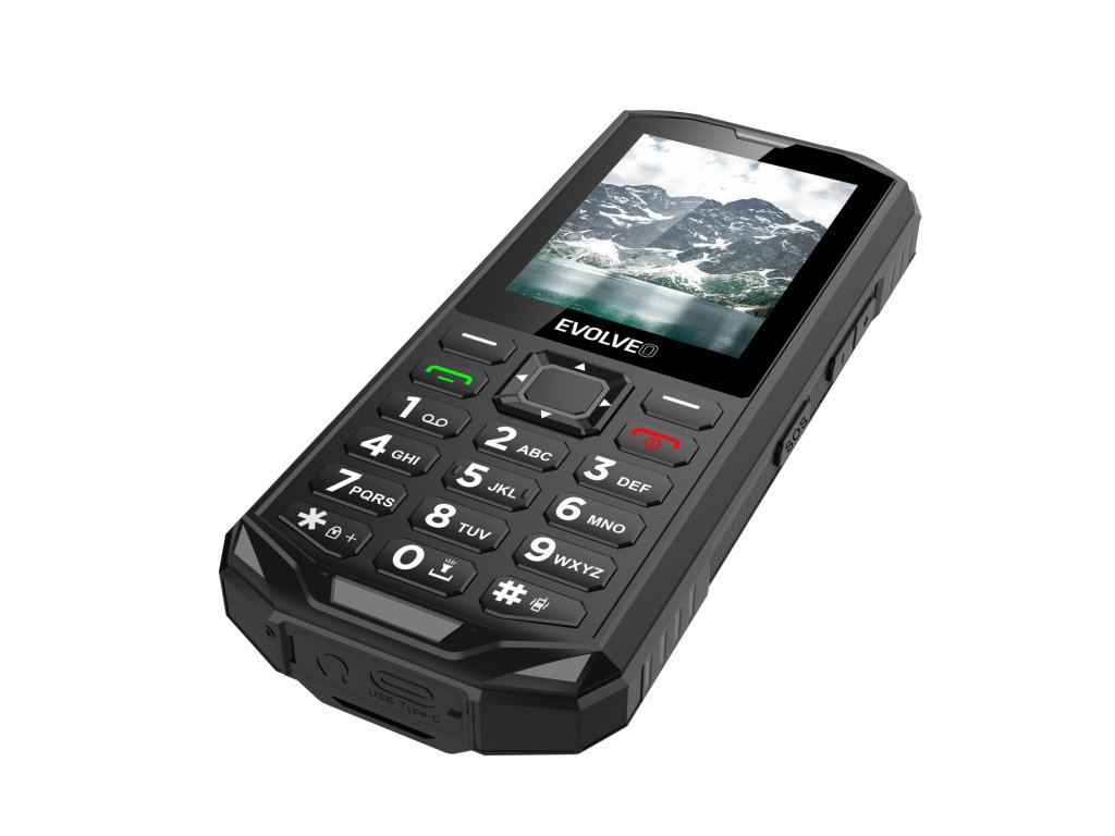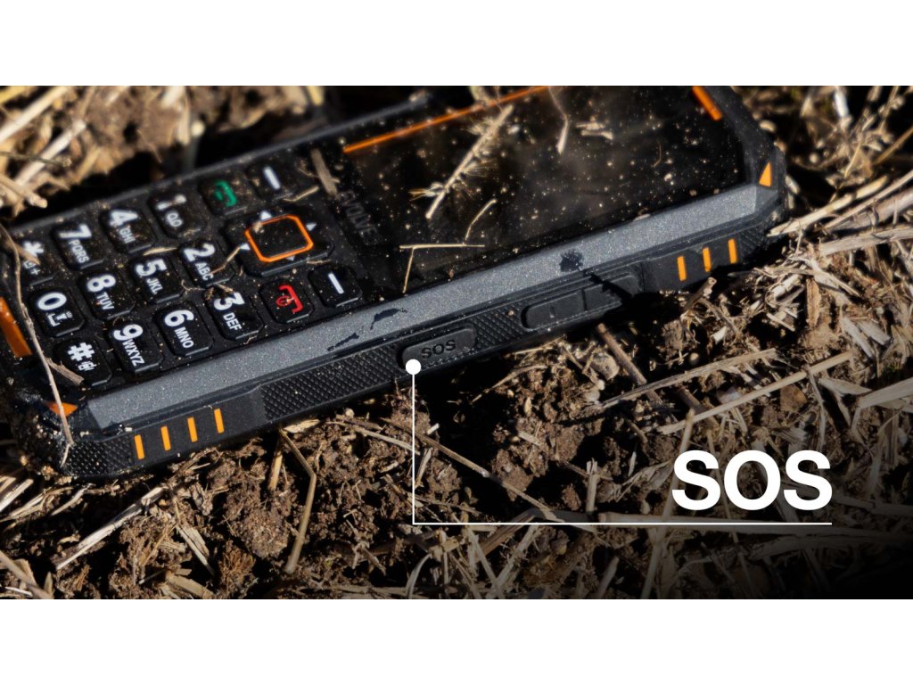 Tlačítkový odolný a vodotěsný mobilní telefon, IP68, barevný 2.4" TN displej, baterie 2500 mAh, Dual SIM, USB-C nabíjecí konektor, silná svítilna, SOS tlačítko