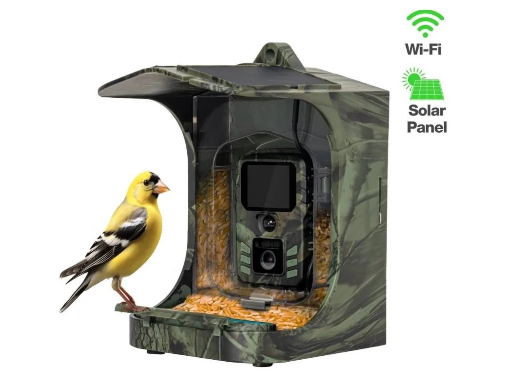 Chytré krmítko pro ptáky s kamerou a solárním panelem