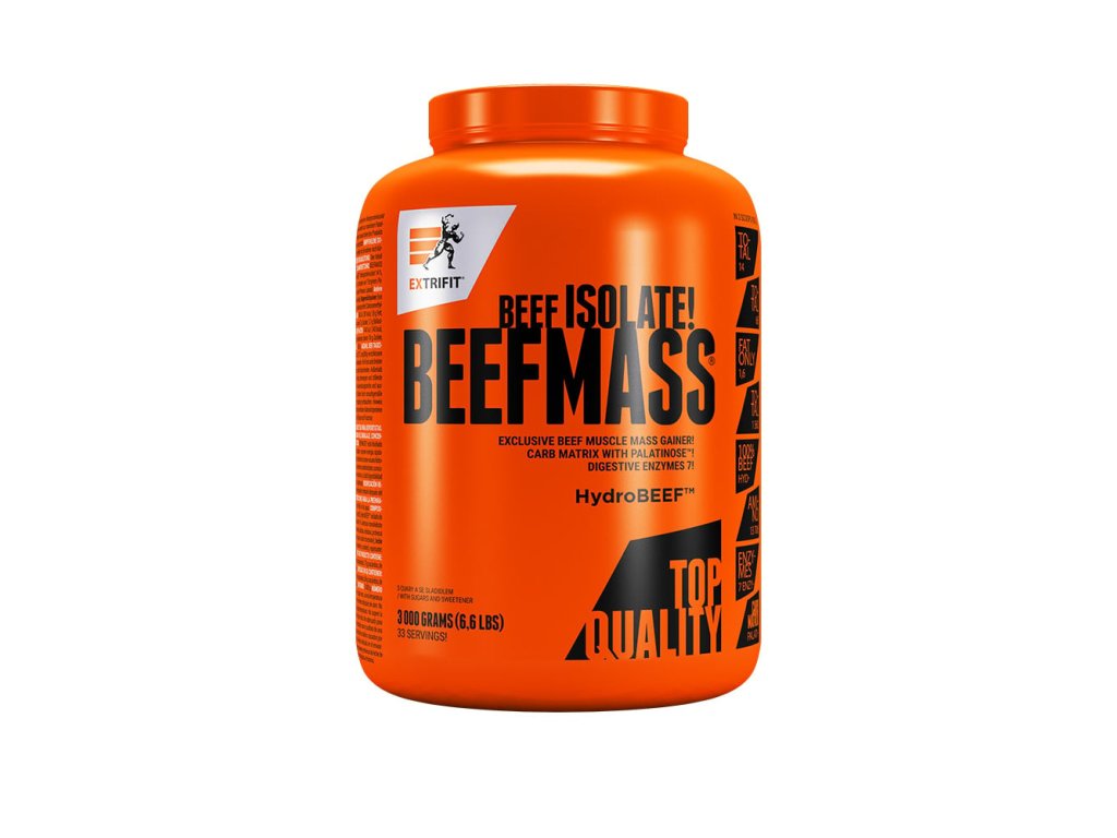 Značkový hovězí proteinový izolát HydroBEEF® (hydrolyzované hovězí peptidy) s obsahem 97 % hovězích bílkovin tvoří proteinový základ gaineru BeefMass®. Ten doplnili kvalitním matrixem sacharidů pro maximální nárůst síly a svalové hmoty.