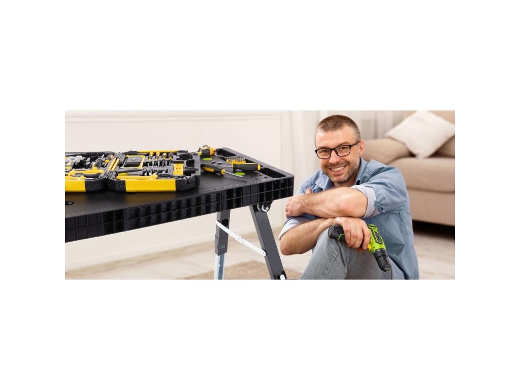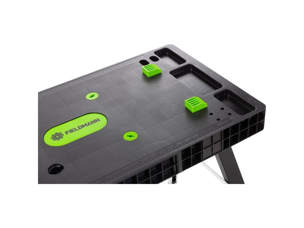 Místa v dílně není nikdy nazbyt, a proto každý kutil ocení chytrý design pracovního stolu FIELDMANN FDN 4250. Tento multifunkční stůl kombinuje 5v1 – od pracovní stanice přes kozu na řezání až po lešení, lehátko pod auto a ruční vozík. Pracovní plocha o rozměrech 94 × 48 cm vám poskytne dostatek místa pro jakoukoli práci a výšku stolu lze nastavit na 52, 66 nebo 80 cm. Snadno si ho tak přizpůsobíte podle aktuální potřeby. Zátěžové kapacity jsou impozantní – stůl unese až 150 kg ve všech režimech a zaručuje tak odolnost a stabilitu i při práci na větších projektech. Díky hmotnosti 13 kg stůl snadno přenesete tam, kde ho právě potřebujete a můžete se hned vrhnout do práce.