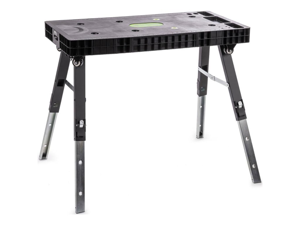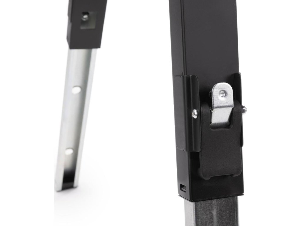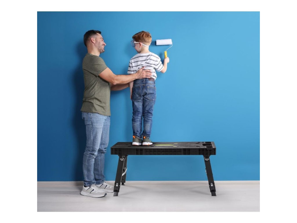 Dílenský stůl, velikost pracovní plochy: 94 (D) × 48 (Š) cm, pracovní výška: 52/66/80 cm, režim lešení – 150 kg, čistá hmotnost: 13 kg