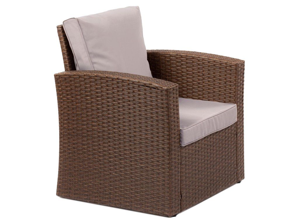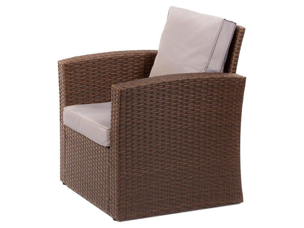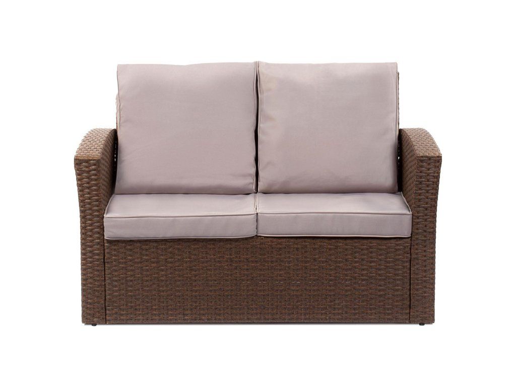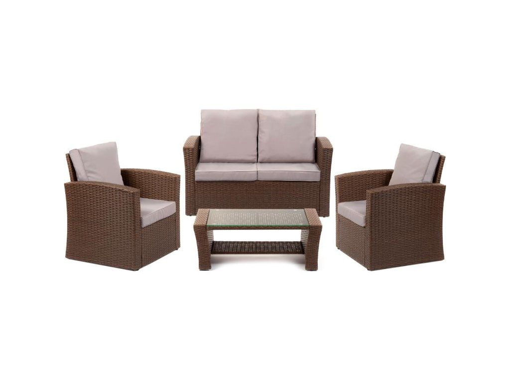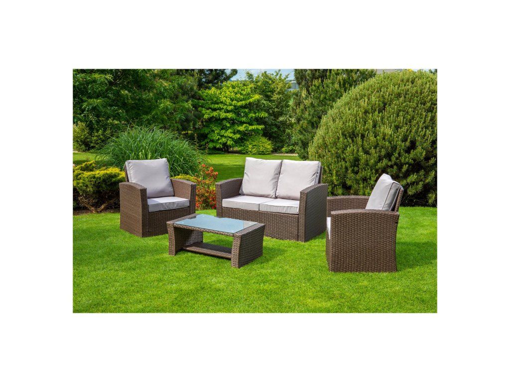 sestava zahradního nábytku • 2 místná sedačka • 2 křesla • konferenční stolek • vhodné pro venkovní i vnitřní použití • součástí sady polštáře a voděodolné potahy • umělý ratan