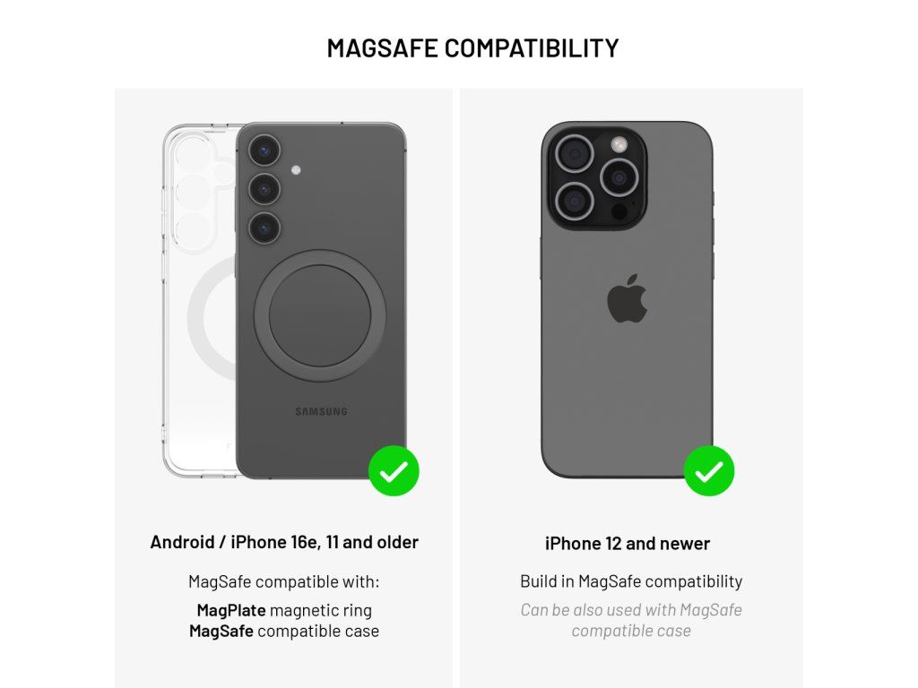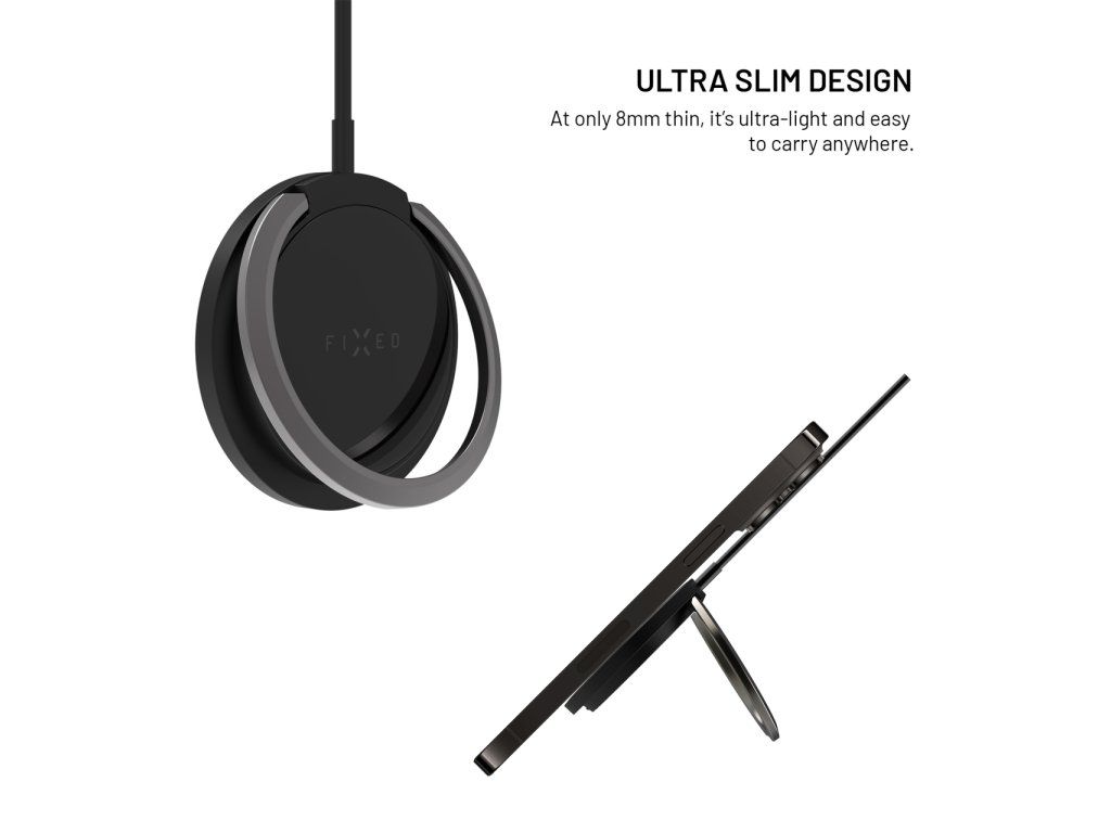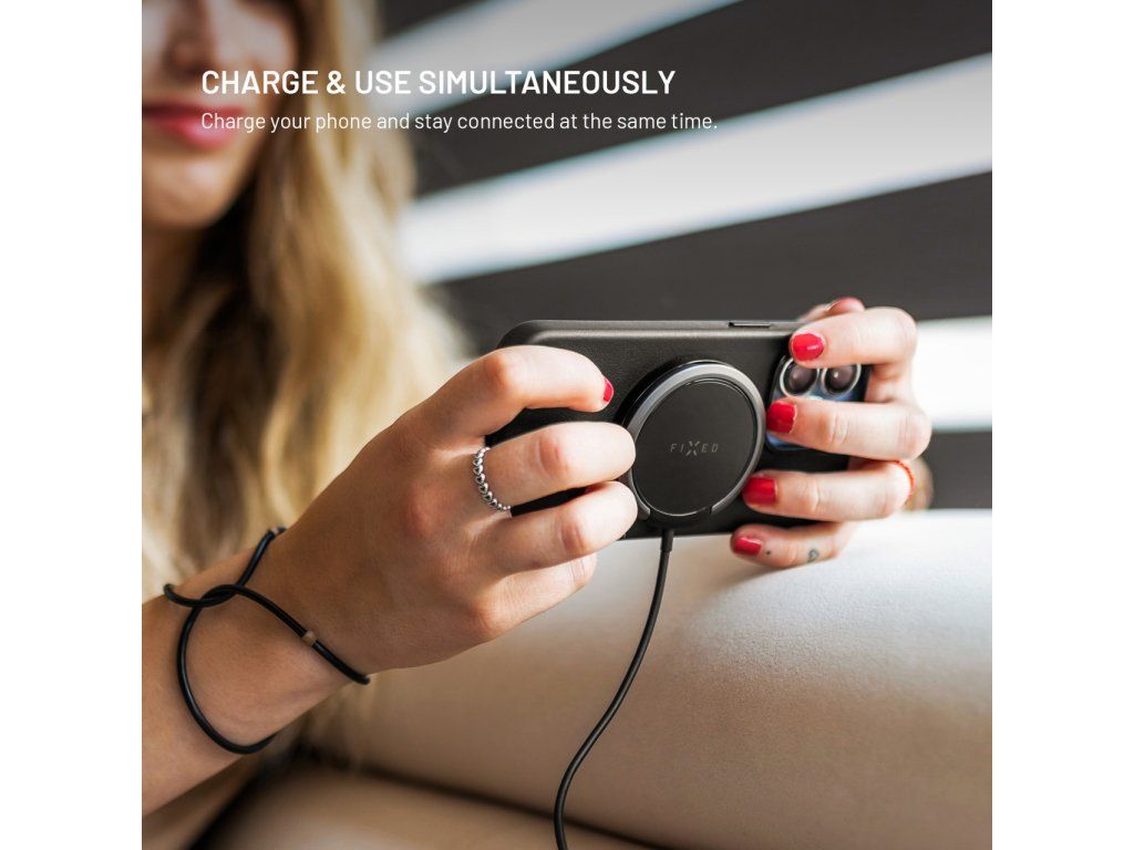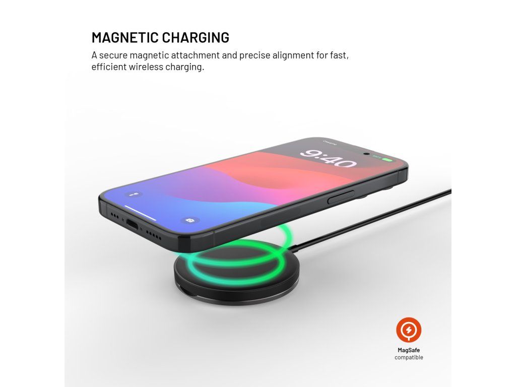 Vylepšená verze oblíbené bezdrátové nabíječky v novém designu s kovovým vyklápěcím stojánkem je navržena přímo pro iPhone 12 a vyšší s podporou funkce MagSafe. Integrované magnety bezpečně uchytí nabíječku k tělu telefonu a usnadní manipulaci při nabíjení. Díky technologii Qi lze nabíjet i smartphony jiných značek s výkonem až 15W (7,5W pro iPhone). Nabíjení se spustí okamžitě po přiložení nabíječky k zádům telefonu, před poškrábáním je chrání jemný silikonový povrch nabíječky. Připojený kabel o délce 1,2 m je ukončený USB-C konektorem pro připojení do nabíjecího adaptéru. Díky stojánku z odolné broušené slitiny si můžete během nabíjení telefon postavit do horizontální nebo vertikální polohy. Tenké tělo nabíječky dokonale splyne se zády telefonu.