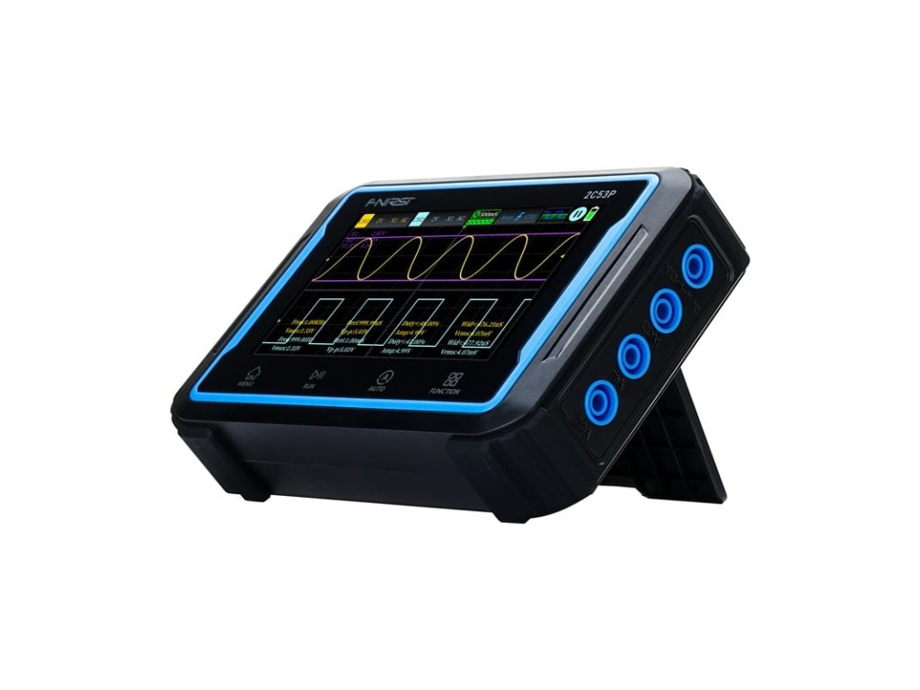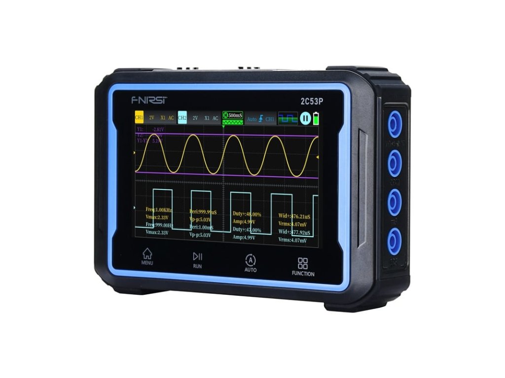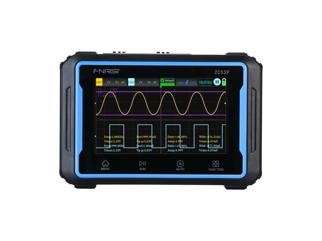 FNIRSI 2C53P je přenosný osciloskop, který kombinuje tři funkce: dvoukanálový osciloskop, digitální multimetr a DDS generátor. Přístroj nabízí rozsáhlé funkce v kompaktním provedení. Je vybaven 4,3palcovým dotykovým displejem IPS s rozlišením 480 × 272 pixelů, který umožňuje intuitivní ovládání a volné prohlížení průběhů s možností zvětšení a posunu. Osciloskop nabízí šířku pásma 50 MHz, vzorkovací frekvenci 250 MSa/s a 12 přepínatelných průběhů. Díky tomu je ideální pro měření napětí, proudu, odporu, kapacity nebo teploty s přesností až 19999 údajů.