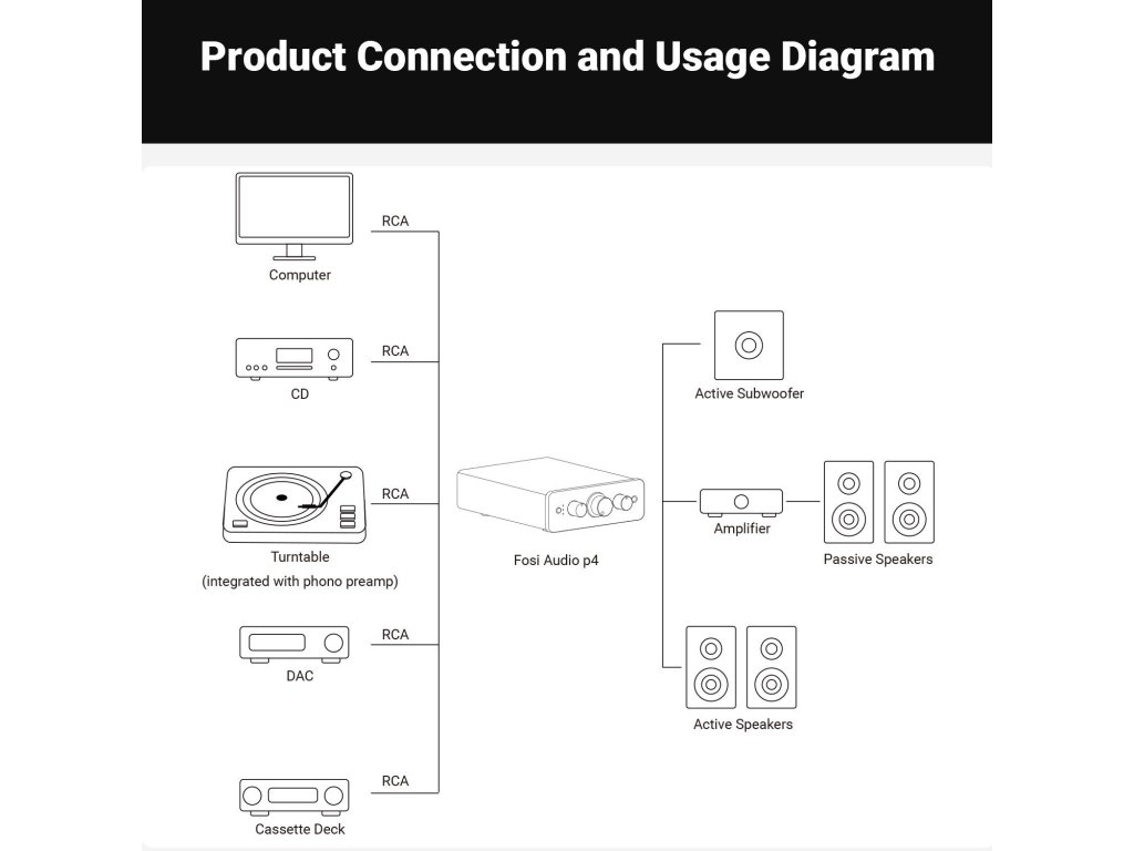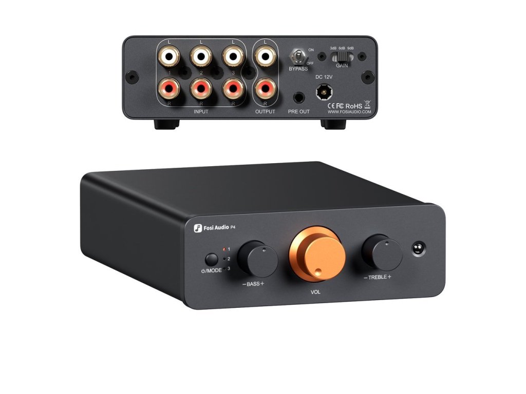 Předzesilovač Vám umožňuje připojit všechny zdroje signálu do jednoho zařízení. Na to P4 nabízí 3x stereo RCA vstup s přepínáním. Výstupy jsou 1x RCA pro koncový zesilovač a 3,5mm jack pro aktivní subwoofer. Výstupní gain je možné přepínat ve třech polohách. Napájení je řešeno externím 12V zdrojem.