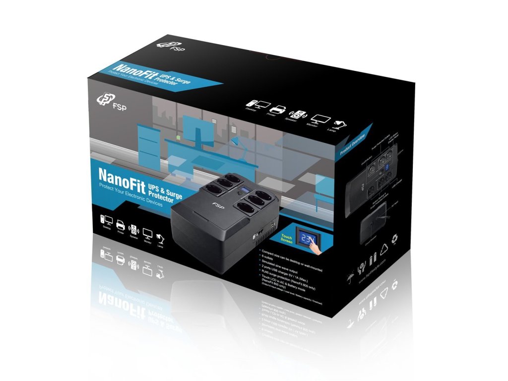 UPS NanoFit je kompaktní zařízení poskytující vynikající ochranu zařízení proti přepětí a špičkám. NanoFit bude v případě výpadku elektřiny poskytovat stabilní napájení, které vám umožní bezpečně vypnout připojené PC. Jeho zabudované mikroprocesorové řízení garantuje vysokou spolehlivost. Tato UPS je ideální pro použití v malých kancelářích a domácnostech. UPS lze upevnit také na stěnu.
