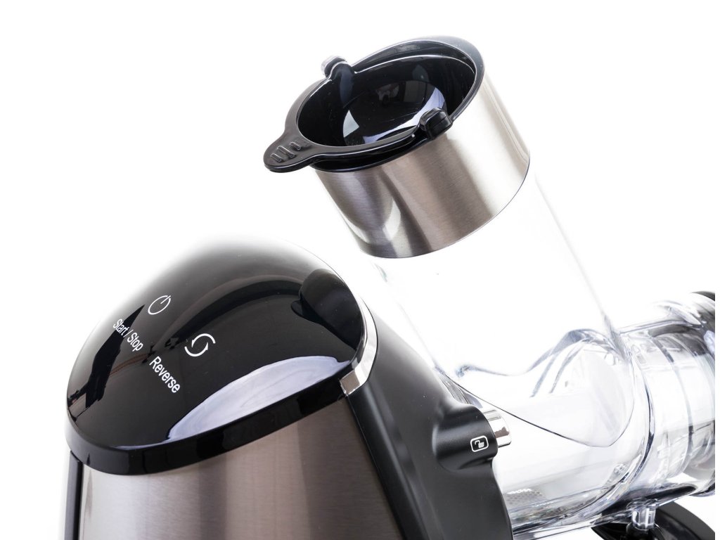 Ovládání odšťavňovače spočívá v přepínání dvou dotykových tlačítek. Jedním tlačítkem přístroj zapnete a vypnete a druhým přepnete na zpětný chod. Když se vám ve šneku zasekne kousek ovoce či zeleniny, nezoufejte. Přepněte na zpětný chod, šnek se uvolní a můžete pokračovat v práci.