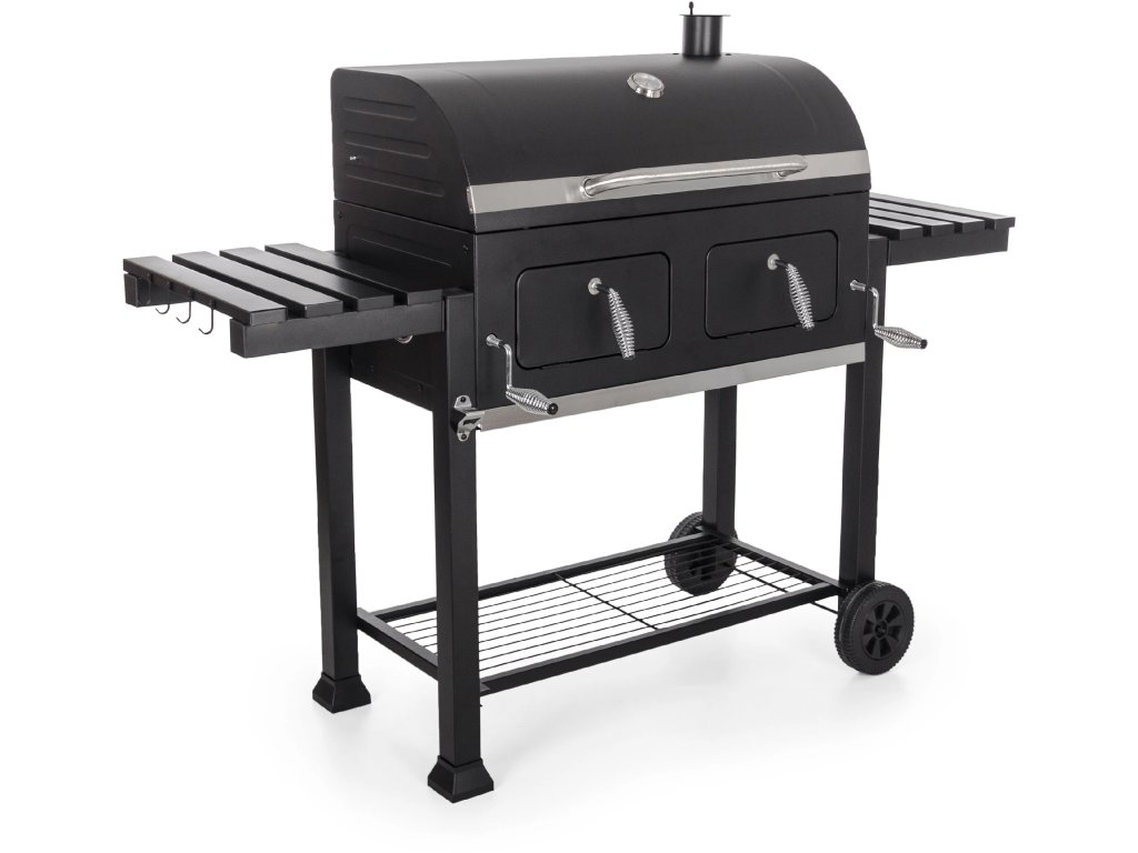 Poctivý gril se dvěma topeništi s regulací výšky, vestavěným teploměrem, odkládacími plochami a pojezdem.