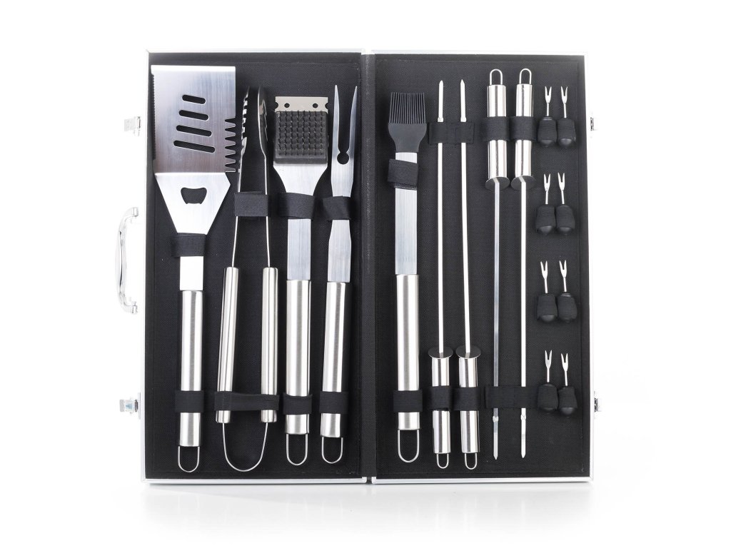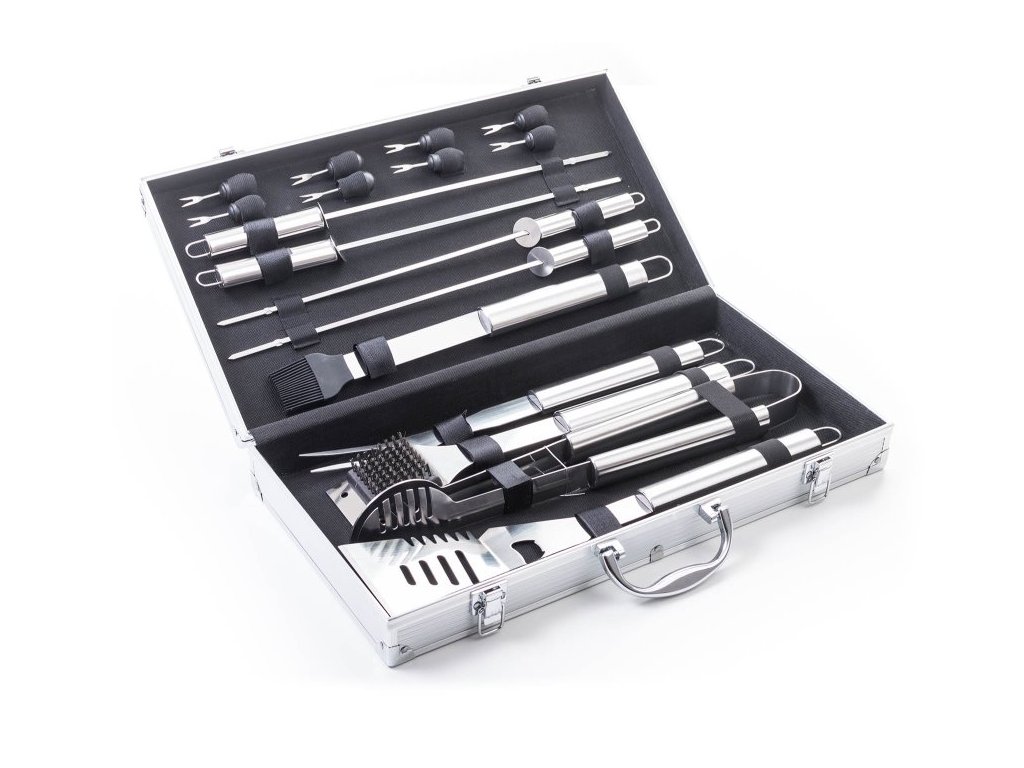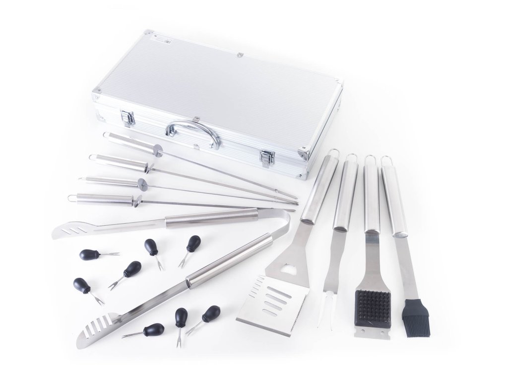 Sada obsahuje kompletní nástroje pro grilování bez potíží. Součástí sady je obracečka, vidlička, kleště, štětec na potírání, čistící kartáč, napichovátka pro snadné jedení klasů kukuřice a grilovací jehlice pro výrobu špízů. Délka nářadí 45 cm zajišťuje, že na vás při grilování nebudou šlehat plameny ani prskat olej z masa. Pro snadné přenášení a skladování je nářadí uloženo do praktického hliníkového kufru.