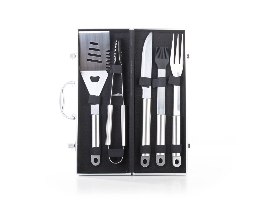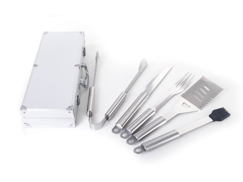Sada obsahuje kompletní nástroje pro grilování bez potíží. Součástí sady je obracečka, vidlička, kleště, prodloužený grilovací nůž a štětec na potírání. Délka nářadí 40 cm zajišťuje, že na vás při grilování nebudou šlehat plameny ani prskat olej z masa. Pro snadné přenášení a skladování je nářadí uloženo do praktického hliníkového kufru.