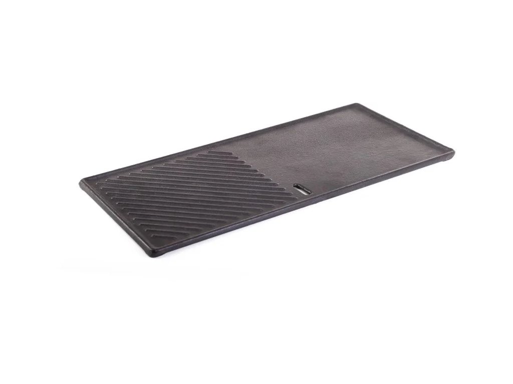 Litina patří mezi nejodolnější materiály, které se pro grilování používají. Je vysoce odolná proti vysokým teplotám a poškrábání. Na každé polovině litinového plátu máte k dispozici jiný druh povrchu. Jedna polovina je hladká a využijete ji především pro grilování nakrájené zeleniny, vajíček a sýrů. Druhá polovina s vroubky je určená pro správné grilování steaků, větších kusů zeleniny a ryb.