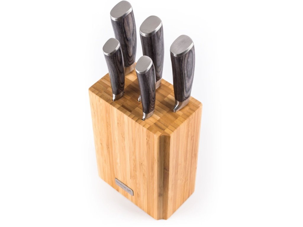 Sada pěti vysoce kvalitních nožů G21 Gourmet Stone s vámi bude krájet, ořezávat i porcovat. Čepele nožů z kvalitní oceli 5CR15, rukojeti z Pakka wood. Bambusový stojan pro správné ukládání nožů