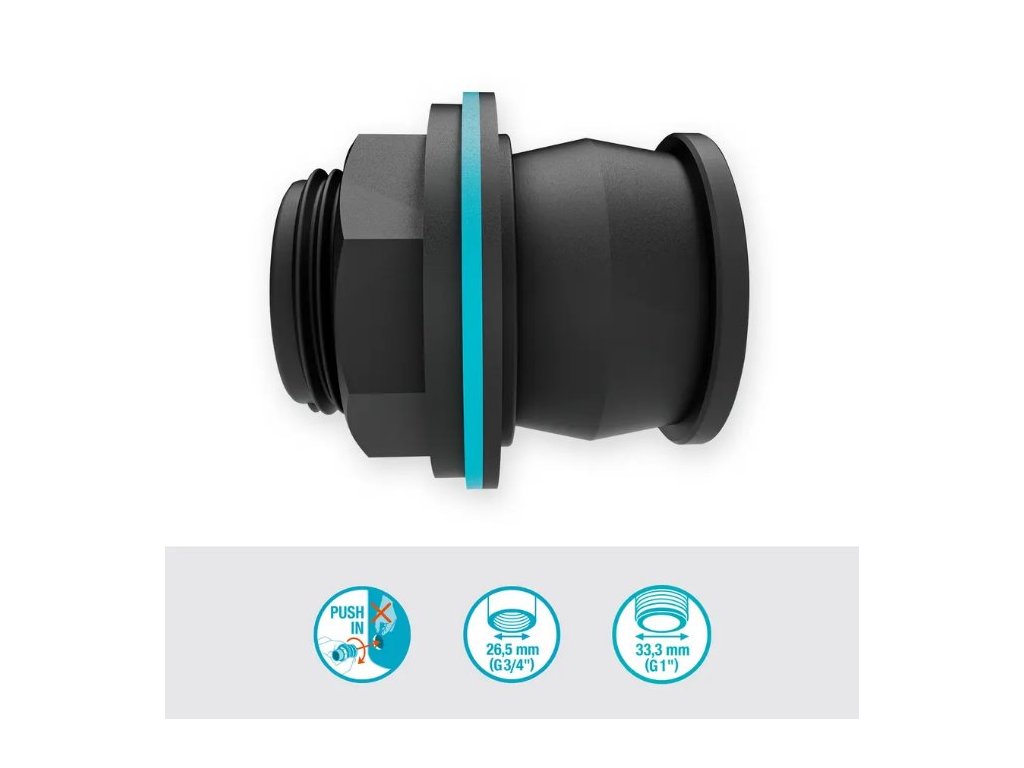 Toto příslušenství ve formě nástrčné přípojky do nádrže vám usnadňuje připojení čerpadla na vodu nebo hadic k nádrži na vodu nebo sudu, abyste si mohli užívat roky snadného čerpání a vypouštění vody. Přípojka je dodávána s vnějším závitem 33,3 mm (G1") a vnitřním závitem 26,5 mm (G3/4"), která umožňuje připojení všech druhů armatur jak na vnitřní, tak na vnější straně nádrže.