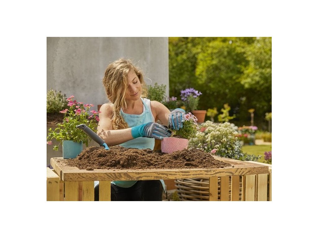 Zahrádkaření je ještě příjemnější s GARDENA rukavicemi pro zahradní práce a péči o rostliny ve velikosti S. Dokonale padnoucí pracovní rukavice pro malé ruce jsou vybaveny mnoha inovativními funkcemi, které usnadňují méně náročné práce na zahradě a péči o rostliny, jako jsou např. rostliny v květináčích a na záhoncích. Hodí se dobře pro sázení nebo otrhávání listů. Silikonový povlak na dlaních poskytuje skvělé uchopení, takže máte vždy vše pod kontrolou, což je obzvláště užitečné při přenášení rostlin. Hlavní část rukavice sestává z pružného a prodyšného síťovaného materiálu. To je velká výhoda, zejména při delším používání, protože se ruce nebudou nadměrně potit. Rukavice jsou vybaveny mikrofleecem absorbujícím pot. Díky pružnému materiálu na manžetě a hřbetu rukou rukavice skvěle padnou. Pokud chcete svůj smartphone nebo tablet používat při práci na zahradě, není to vůbec žádný problém. Špičky ukazováčku a palce jsou opatřeny praktickou funkcí pro chytré telefony Mobile Touch, takže při ovládání telefonu nemusíte rukavice sundávat. Rukavice pro zahradní práce a péči o rostliny navíc získaly certifikát Oeko-Tex® Standard 100, což znamená, že použité textilie neobsahují žádné škodlivé látky.65 % polyester, 15 % nylon, 12 % bavlna, 6 % polyuretan, 2 % elastan