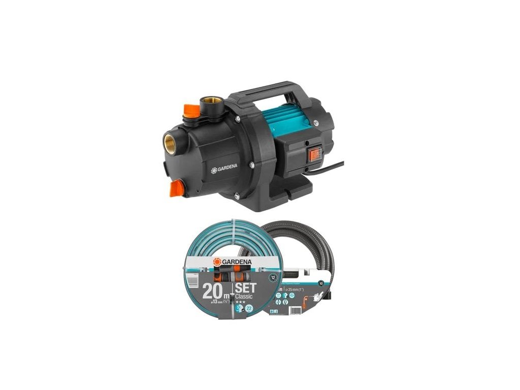 GARDENA zahradní čerpadlo - sada obsahuje vše, co potřebujete k rychlému připojení a uvedení vašeho elektrického čerpadla do provozu. Kompletní řešení zahrnuje klasické zahradní čerpadlo 3000/4, 3,5 metru dlouhou sací hadici a originální zahradní hadici GARDENA o délce 20 metrů, včetně postřikovače a konektorů.