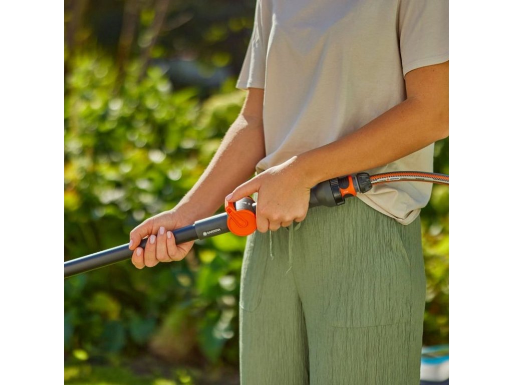 Po připojení k zahradní hadici lze přívod vody plynule regulovat a vypínat jediným pohybem ruky.