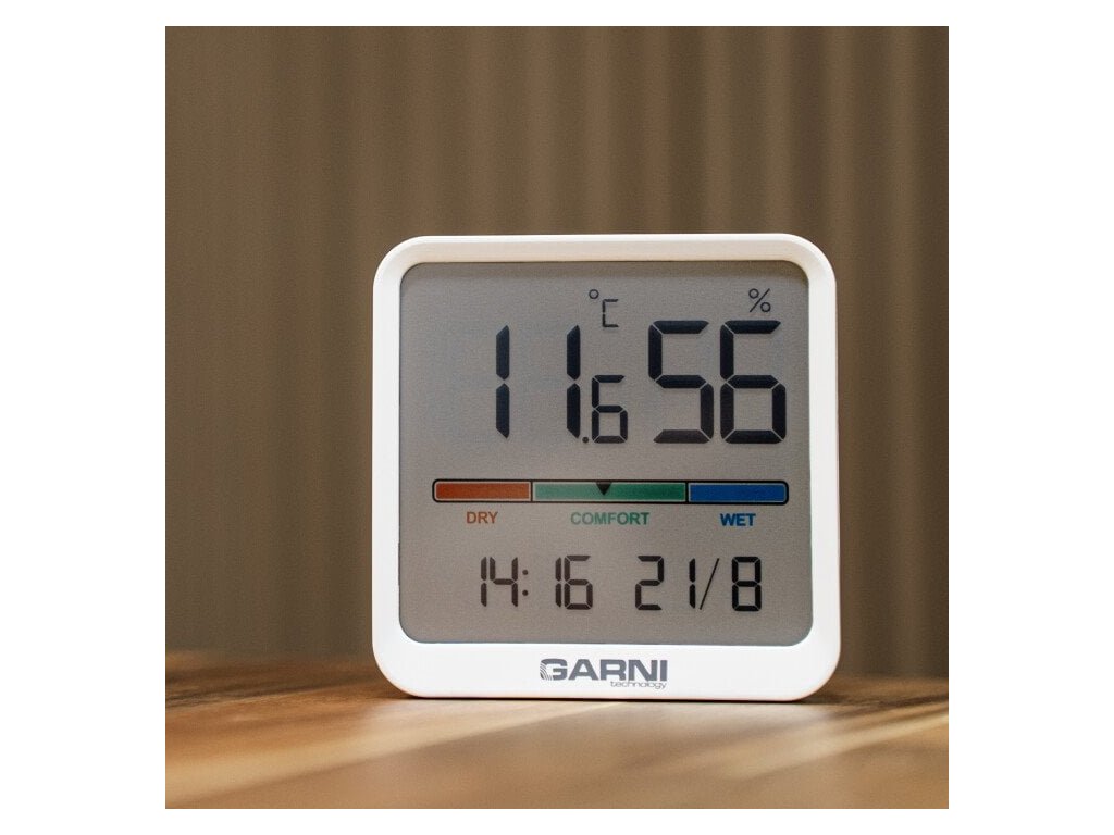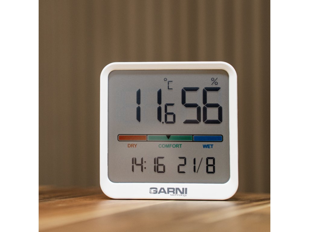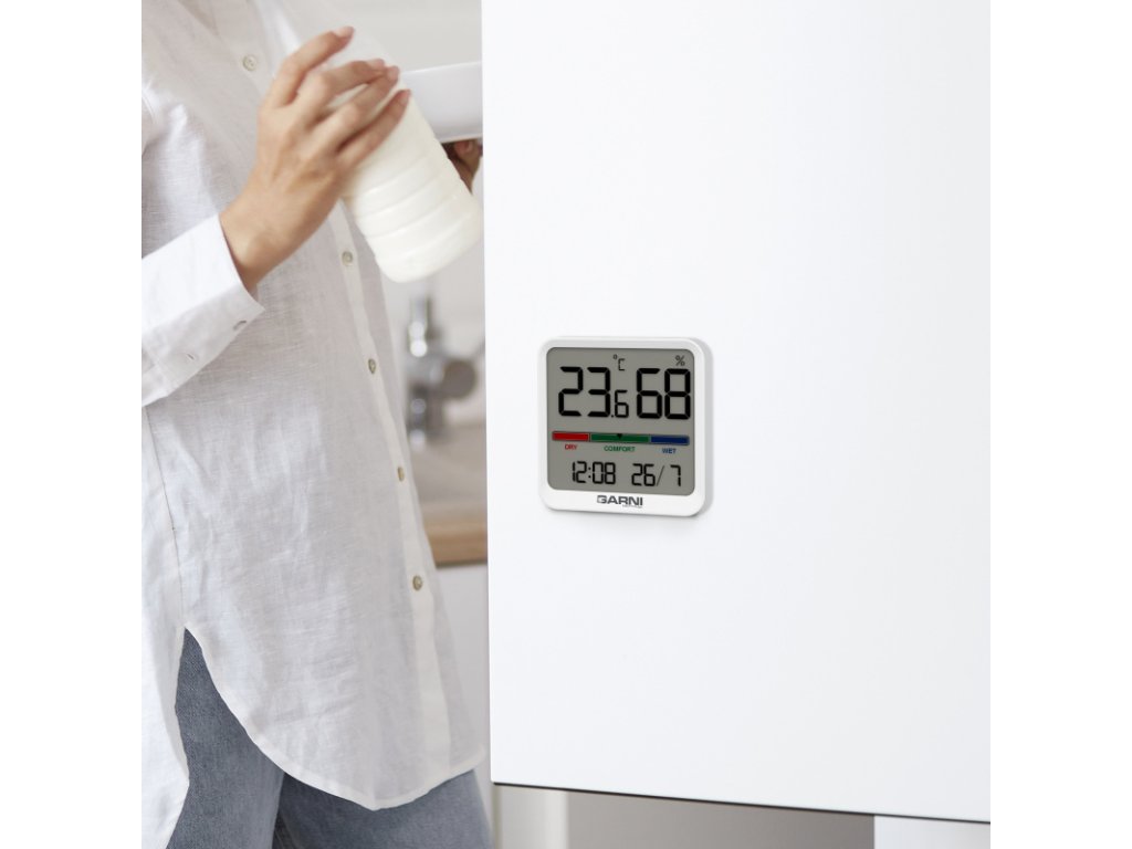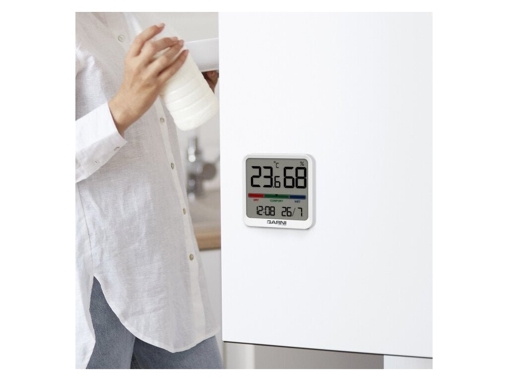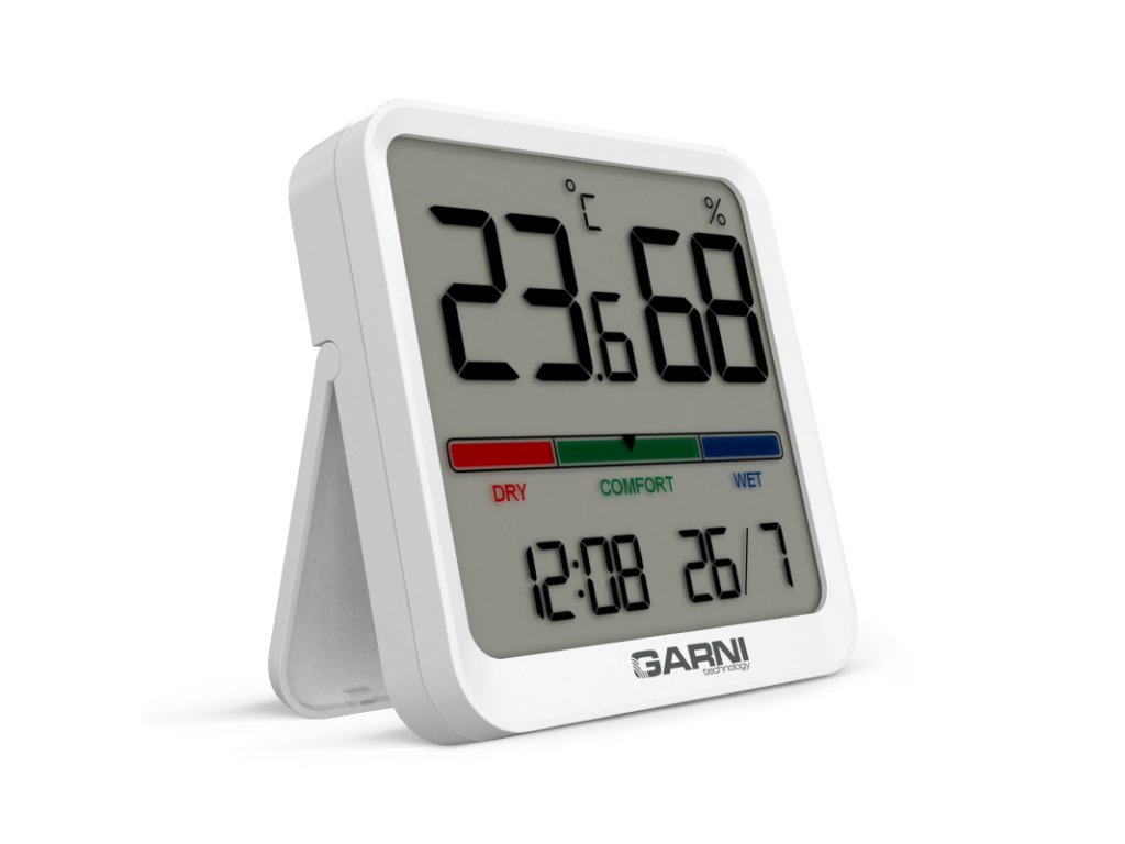 Digitální teploměr s vlhkoměrem, měření teploty a relativní vlhkosti v interiéru, zobrazení času a data.