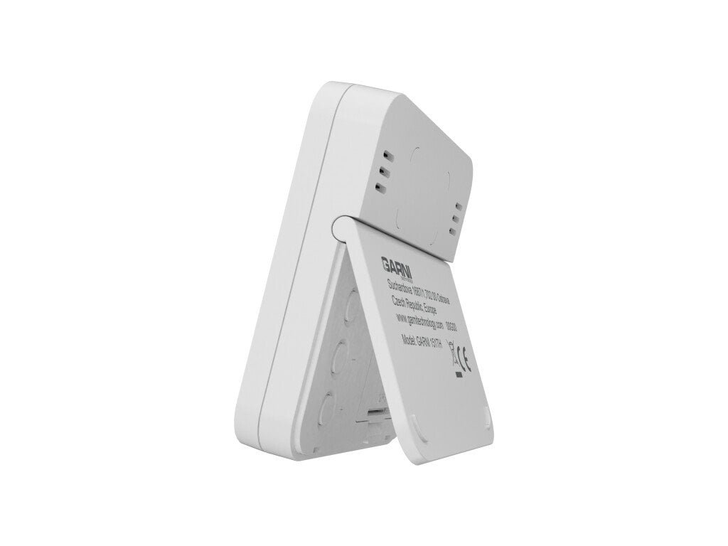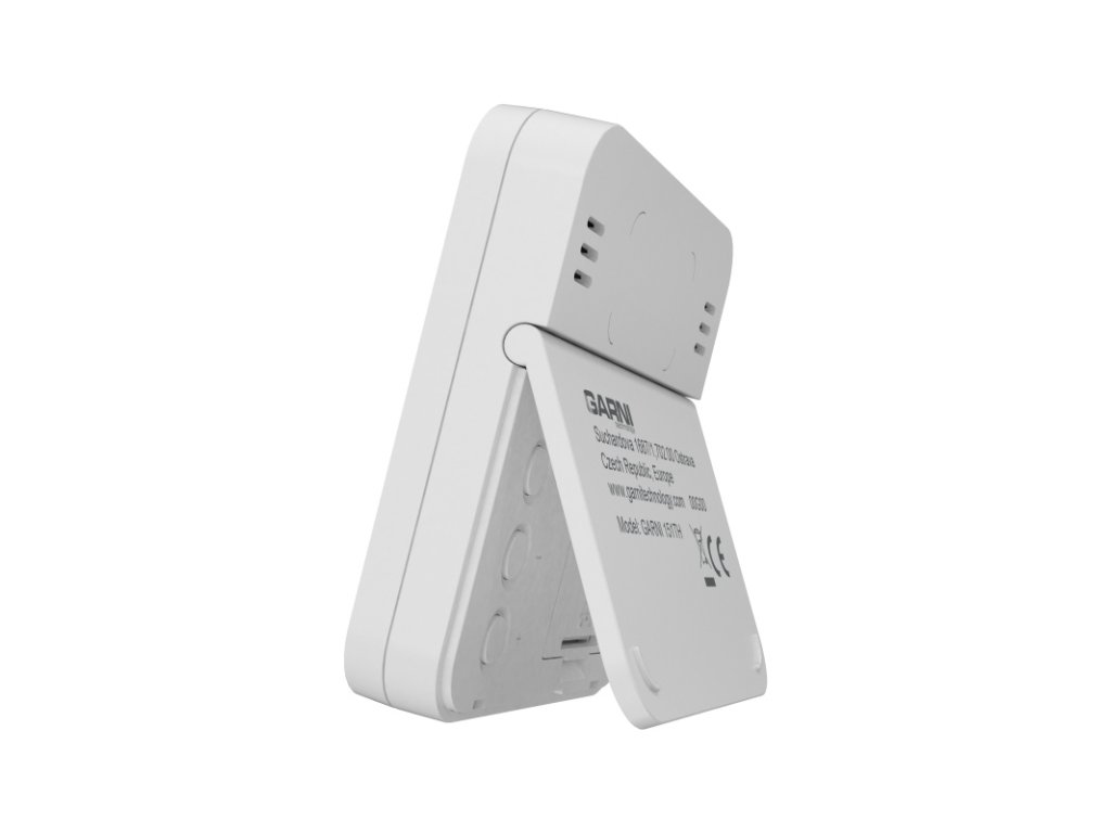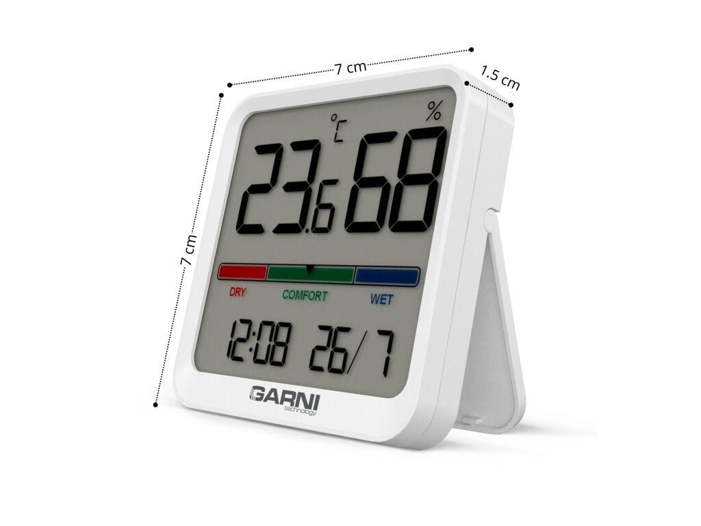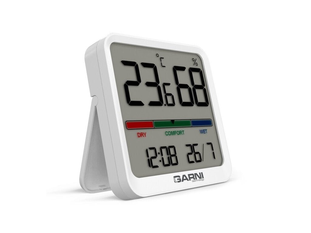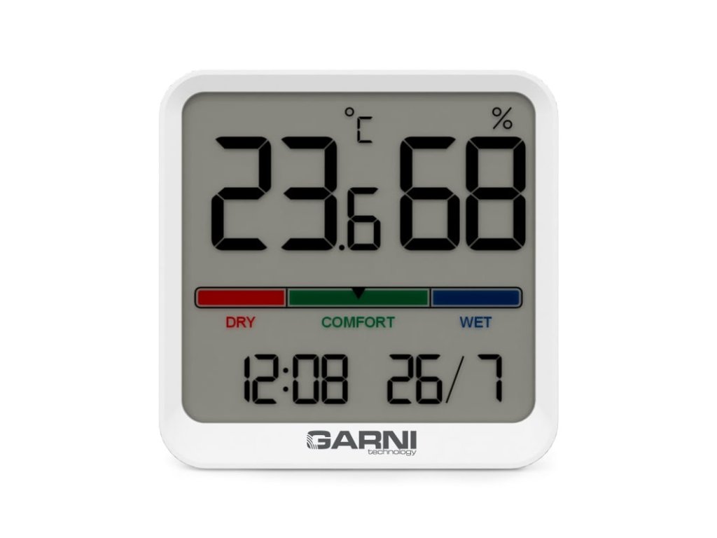 Digitální teploměr s vlhkoměrem, měření teploty a relativní vlhkosti v interiéru, zobrazení času a data.
