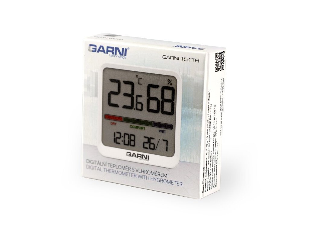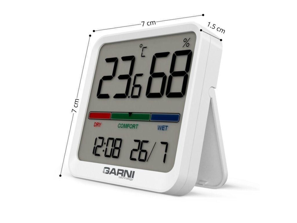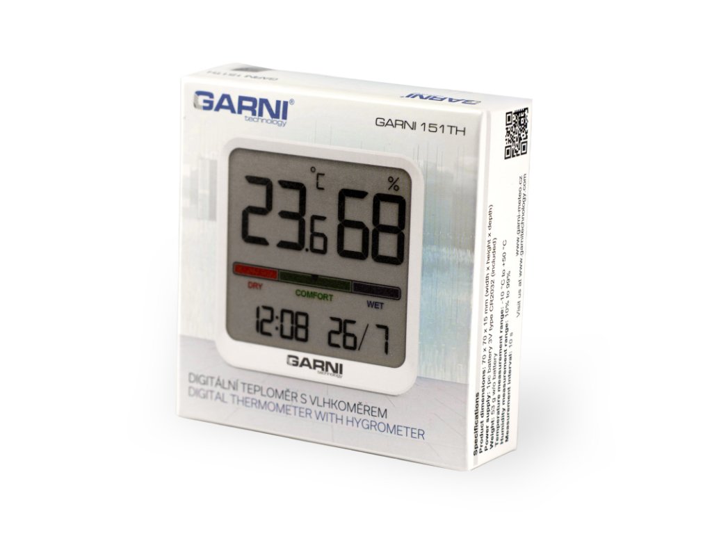 Digitální teploměr s vlhkoměrem pro měření teploty a relativní vlhkosti v interiéru. Zobrazení času a data.