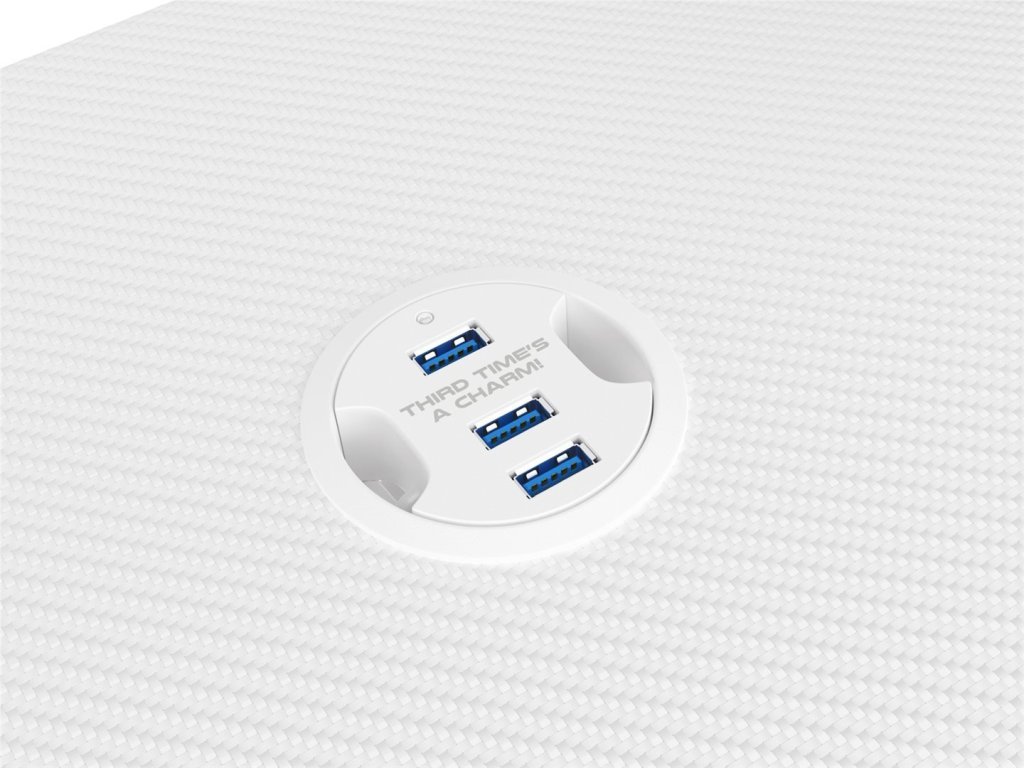 Stůl je vybaven HUBem se třemi porty USB 3.0 a přihrádkami na kabely pro připojení dalšího vybavení a uspořádání kabelů. Vestavěná bezdrátová indukční nabíječka v desce stolu vám umožní kdykoli nabíjet mobilní zařízení a mít je stále na očích. Vsaďte na praktická řešení a nenechte se omezovat!