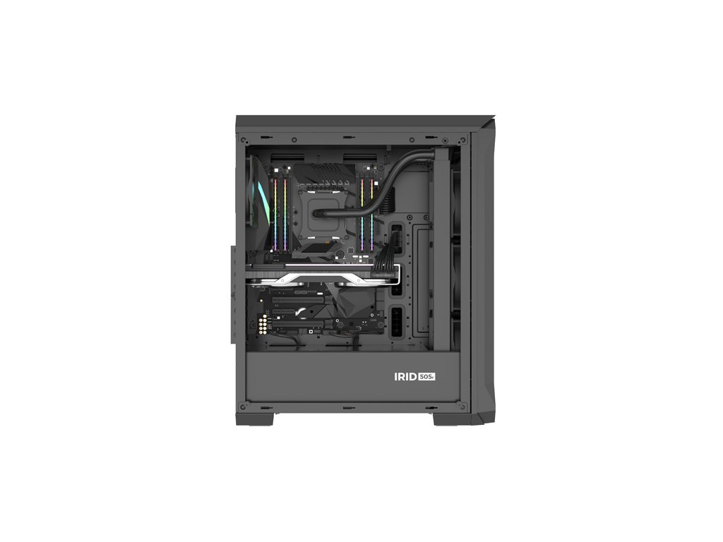 Široké možnosti montáže hotových sad vodního chlazení jsou jednou z největších výhod Genesis Irid 505F. Přední část skříně umožní montáž sad AIO 240/280 a 360, a to i se silnějším chladičem. Na horní stranu můžete nainstalovat AIO 240/280 se standardním chladičem (~27 mm) nebo "tlustší" AIO 240 (s chladičem ~38 mm), aniž by došlo ke kolizi se základní deskou nebo operační pamětí.