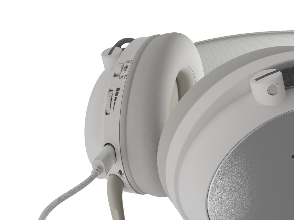 Herní sluchátka s mikrofonem, odnímatelný kabel a mikrofon, ovládání hlasitosti a přepínač mikrofonu na náušníku, 53mm měniče, Stereo 2.0, délka kabelu 100cm, bílé provedení.