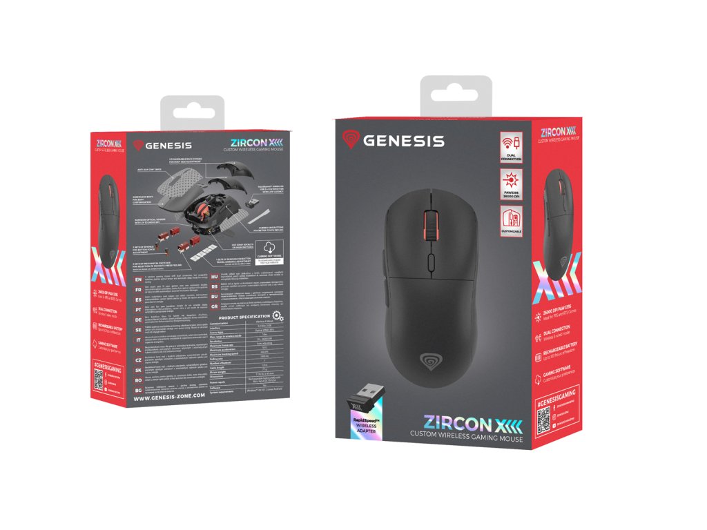 Seznamte se s jednou z nejpokročilejších myší na trhu. Představujeme vám GENESIS Zircon XIII s konstrukcí nabízející vše, co skutečně potřebujete. Plné přizpůsobení hardwaru (vyměnitelné spínače, vzdálenosti, pružiny), jeden z nejlepších snímačů na světě(Pixart PAW3395) a technologie bezdrátového připojení(RapidSpeed™ Wireless) pro skutečně drátový výkon, a to není vše. S GENESIS Zircon XIII hra teprve začíná.