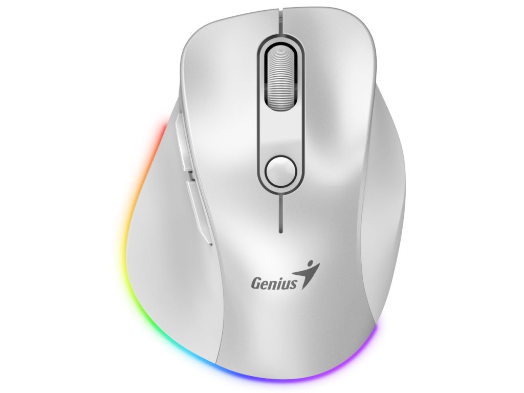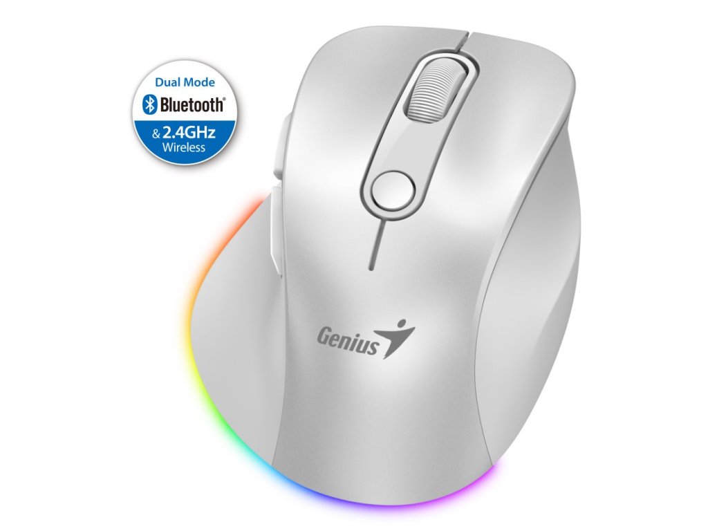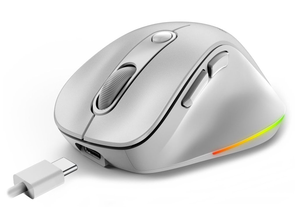 Ergonomická bezdrátová myš v kompaktním provedení disponuje optickým senzorem s nastavitelným rozlišením až 2400 DPI. Připojení k počítači je realizováno bezdrátově skrze Bluetooth nebo miniaturní USB přijímač a rozhraní 2,4 GHz. Myš se dokáže připojit až ke 3 zařízením zároveň, mezi nimi pak můžete přepínat stiskem jediného tlačítka (Dual BT režim + 2,4 GHz). USB přijímač lze pro snadné přenášení uschovat v těle myši. Napájení zajišťuje vestavěná dobíjecí baterie s kapacitou 500 mAh, kterou lze nabíjet pomocí USB-C portu. Potěší také stylové sedmibarevné podsvícení.