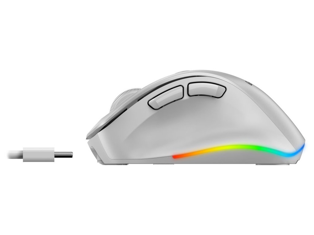 Myš, bezdrátová, optická, 2400DPI, 6 tlačítek, Bluetooth, 2,4GHz, USB-C nabíjení, tichá, 7barevné podsvícení, bílá