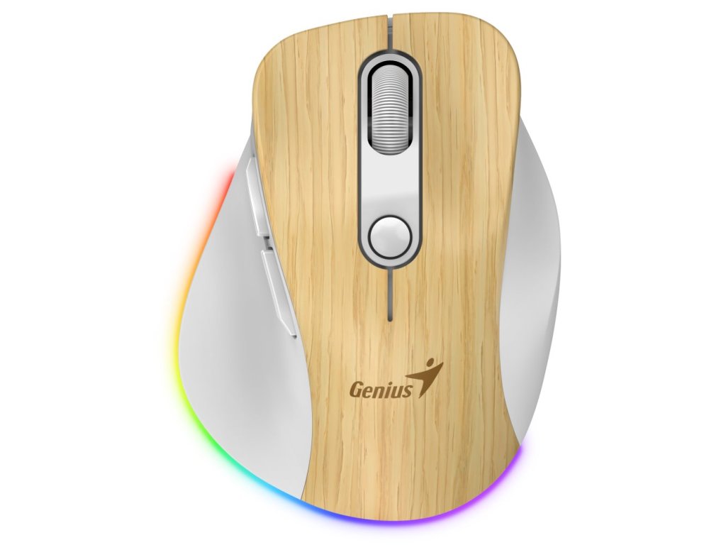 Bezdrátová optická myš, rozlišení 800/1200/1600/2400 DPI, 6 tlačítek, připojení přes Bluetooth/2,4GHz, vestavěná dobíjecí 500 mAh baterie, nabíjení přes USB-C, tichá, 7barevné RGB podsvícení, bílo-hnědá (borovice)