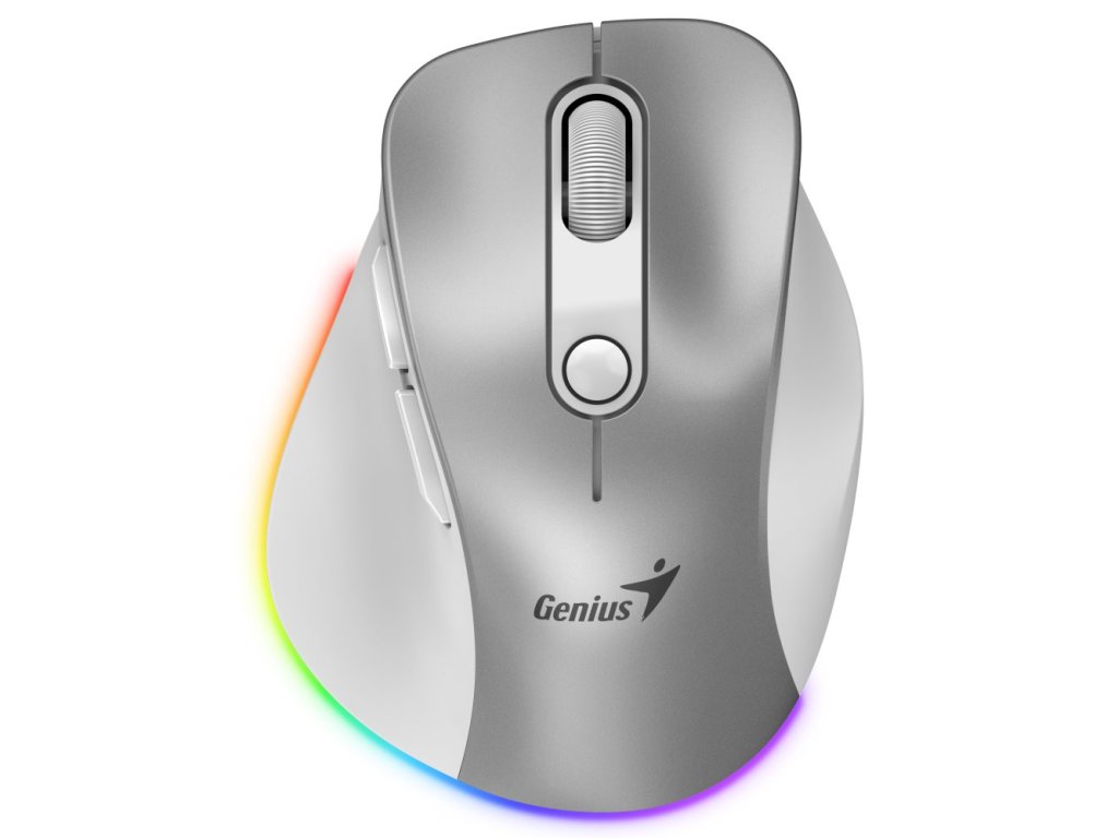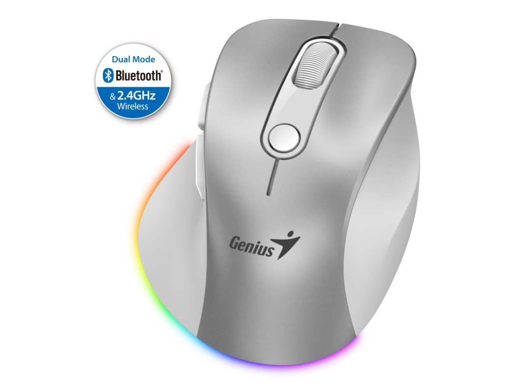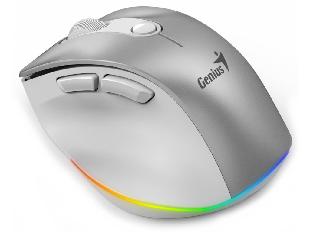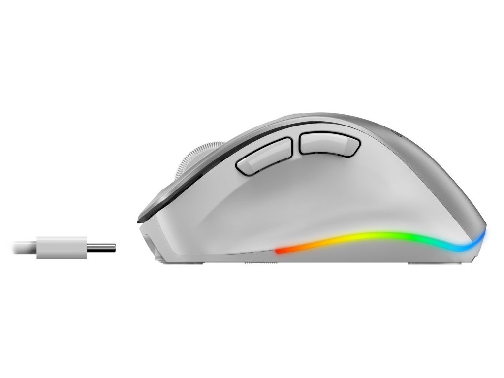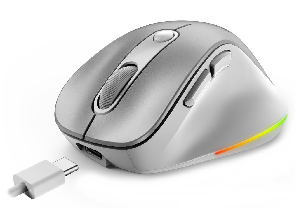 Ergonomická bezdrátová myš v kompaktním provedení disponuje optickým senzorem s nastavitelným rozlišením až 2400 DPI. Připojení k počítači je realizováno bezdrátově skrze Bluetooth nebo miniaturní USB přijímač a rozhraní 2,4 GHz. Myš se dokáže připojit až ke 3 zařízením zároveň, mezi nimi pak můžete přepínat stiskem jediného tlačítka (Dual BT režim + 2,4 GHz). USB přijímač lze pro snadné přenášení uschovat v těle myši. Napájení zajišťuje vestavěná dobíjecí baterie s kapacitou 500 mAh, kterou lze nabíjet pomocí USB-C portu. Potěší také stylové sedmibarevné podsvícení.