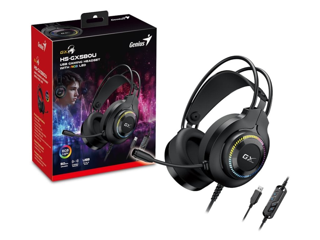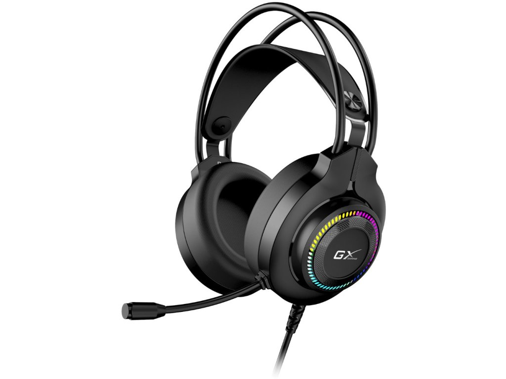 Náhlavní herní drátový headset s mikrofonem, integrované ovládací prvky na kabelu, RGB LED podsvícení, 50mm měniče, připojení přes USB, délka kabelu 2m, černý