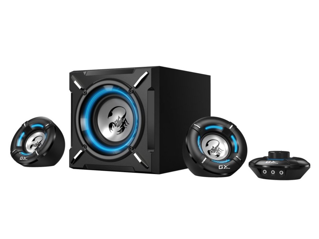 Designové herní reproduktory v konfiguraci 2.1 s celkovým výkonem 26 W. Přítomný zesilovač disponuje ovládáním hlasitosti, díky kterému si můžete užít hlasitý zvuk dle libosti, sluchátkovým výstupem a vstupem pro mikrofon. Herní design doplňuje modré podsvícení.