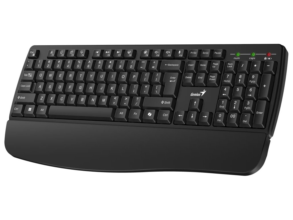 Klávesnice Genius KB-7123 představuje ideální volbu pro každodenní práci v kanceláři nebo z domova. Vyznačuje se klasickým rozložením kláves i přítomností numerického bloku, takže podporuje psaní i zadávání číselných znaků tak, jak jste zvyklí. Díky ergonomickému designu s nízkoprofilovým tvarem kláves a integrovanou opěrkou zápěstí zajistí komfort i přesné psaní i při dlouhodobém užívání. Potěší také odolná konstrukce, která klávesnici Genius KB-7123 chrání při polití a umožní náročnější provoz. Pro bezdrátové připojení slouží 2,4GHz USB přijímač s dosahem až 10 metrů.