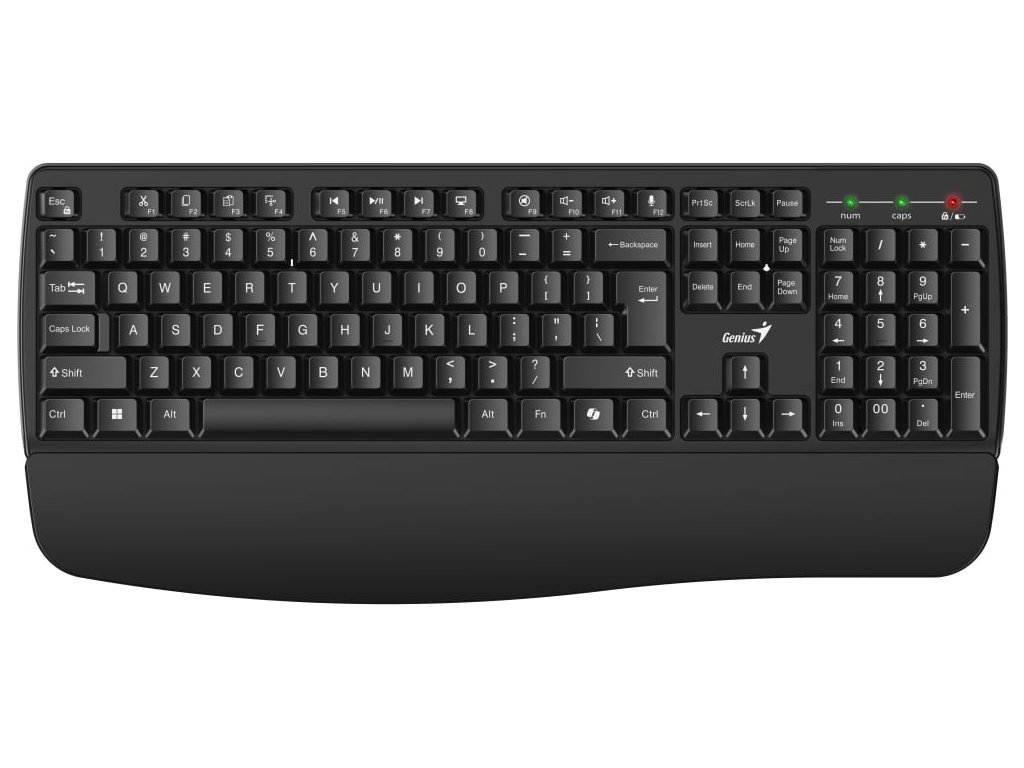 Genius KB-7123 je bezdrátová business klávesnice s integrovanou opěrkou zápěstí, která poskytuje stabilní oporu a umožňuje udržovat ruku v příjemné a uvolněné poloze při psaní. Díky tomu je ideální pro dlouhodobé a pohodlné psaní bez únavy.