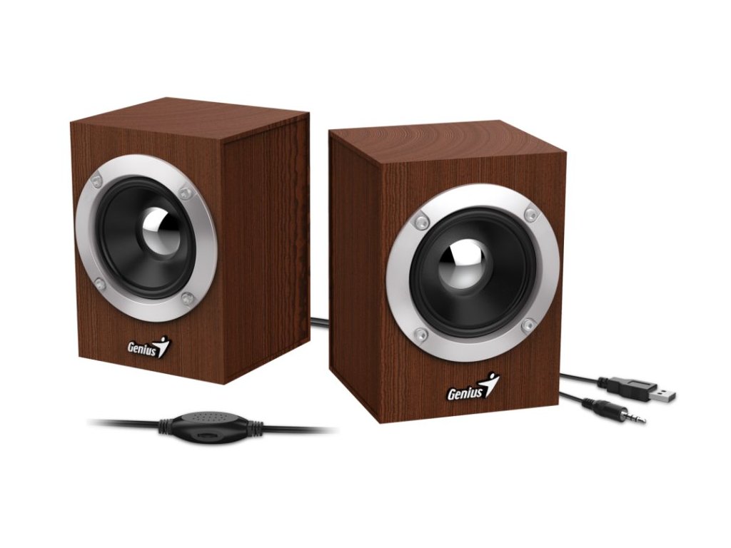 Dřevěné multimediální reproduktory v konfiguraci 2.0 s celkovým výkonem 6 W poskytují kvalitní a nezkreslený stereofonní zvuk. Ovládání hlasitosti je umístěno na 1,2 m dlouhém kabelu. Připojení lze jednoduše realizovat skrze 3,5 mm konektor. K napájení slouží USB port.