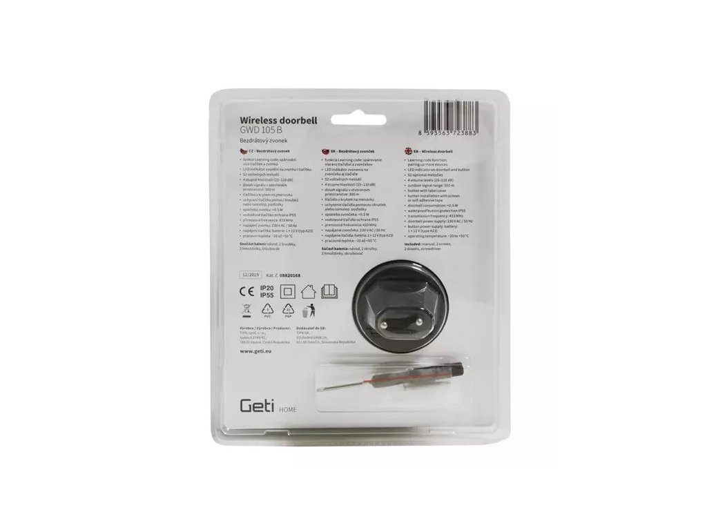 Spolehlivý zvonek GETI GWD 105 B se hodí nejen k domu či bytu, ale také do kanceláří, továren či recepčních hal. Velkou předností tohoto zvonku je jeho bezdrátové provedení s dosahem až 300 m ve volném prostoru. Instalace zvonku je velmi snadná, spárování mezi vysílačem a zvonkem probíhá automaticky. Funkce LEARNING CODE navíc umožnuje vzájemné spárování více tlačítek a zvonků. Nemusíte se obávat ani deštivého počasí, tlačítko vysílače s LED indikací je voděodolné. Zvonek má jednoduchý moderní design, 4 stupně hlasitosti, výběr z 52 vyzváněcích melodií a světelnou signalizace zvonění. Velkou výhodou zvonku je zapamatování si nastavené melodie a hlasitosti i po odpojení přístroje od elektrické sítě.