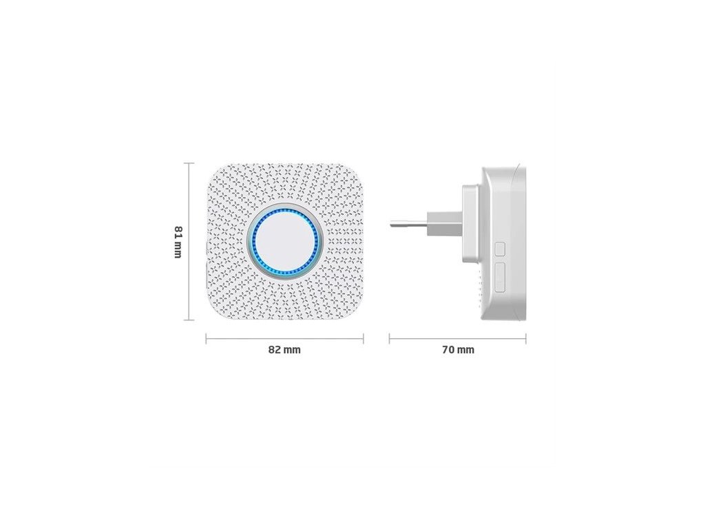 Součást balení: zvonek, tlačítko, návod, 2 šroubky, 2 hmoždínky, šroubovák