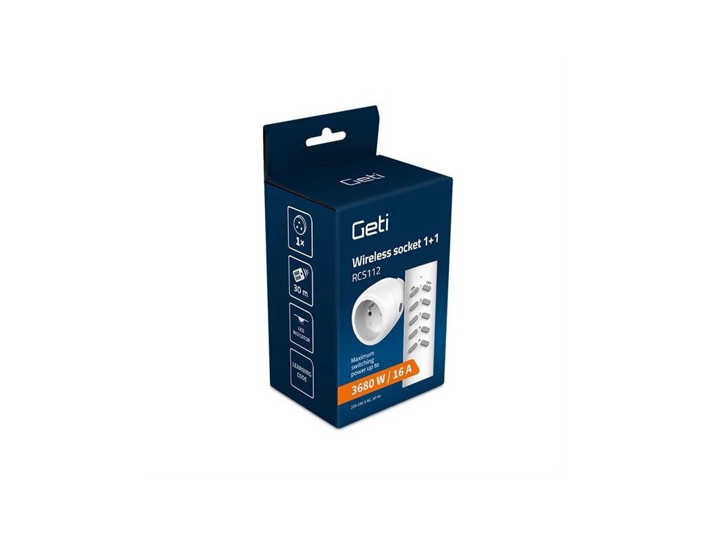 Sestava bezdrátově ovládané zásuvky GETI RCS112 obsahuje dálkový ovladač a 1 zásuvku 230V s přijímačem. Je určena pro dálkové zapínání a vypínání elektrických spotřebičů jako jsou světla, televizory, počítače, vánoční osvětlení a podobně. Zejména v místech, kde není snadný přístup např. za skříněmi, je toto řešení ideální. Pomocí dálkového ovladače můžete zapínat a vypínat elektrická zařízení přes nábytek i zdi. Pamatujte na to, že přes různé překážky se dosah zařízení snižuje. Maximální připojená zátěž je 3680 W/16 A. Zásuvku lze ovládat také ručně tlačítkem.
