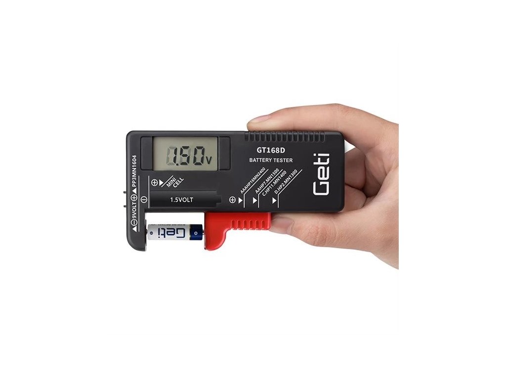 Tester baterií GETI GT168D, je praktický přístroj, který Vám umožní rychle a bezpečně zkontrolovat stav vašich baterií. Přístroj je vybaven LCD displejem, na kterém se zobrazují naměřené hodnoty. Měření se provádí přiložením kontaktů (+/-) baterie na kovové kontakty testeru.