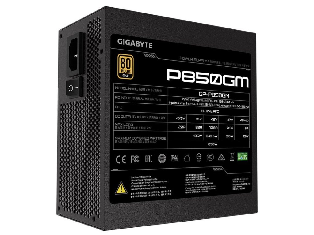 GIGABYTE zdroj P850GM, 850W, 80Plus Gold, 120 mm fan.