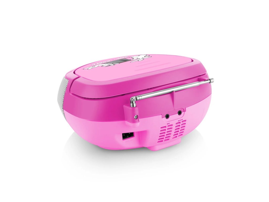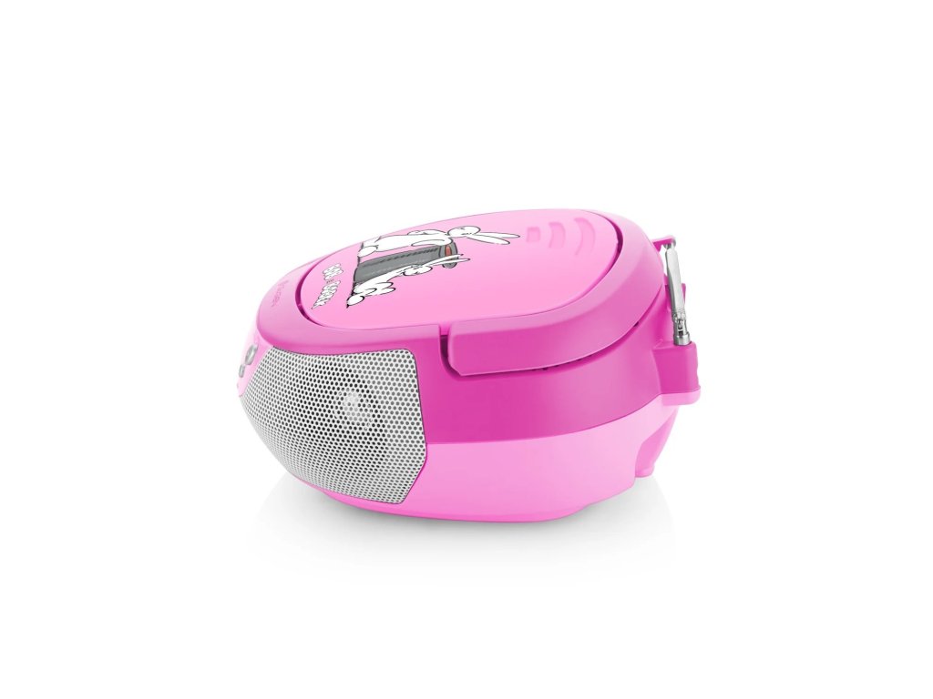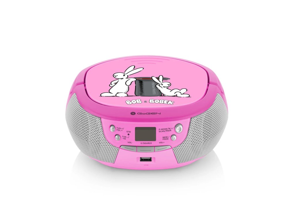 Radiopřijímač s CD BOB a BOBEK, digitální FM tuner, Karaoke, Bluetooth V5.4, USB vstup, AUX in, výkon 1,6 W RMS, mikrofon v balení, napájení ze sítě nebo bateriemi, růžový