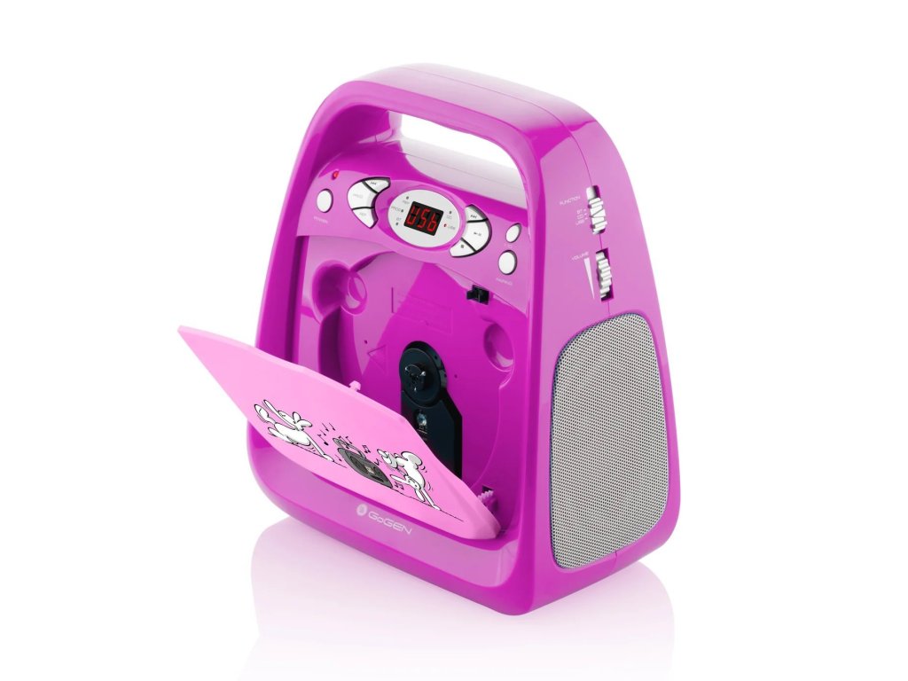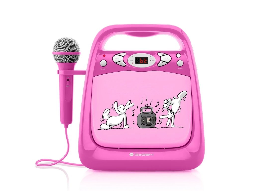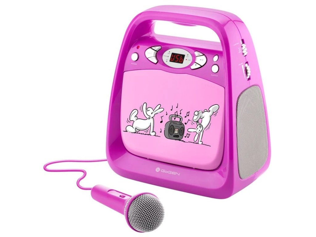 Přehrávač CD BOB a BOBEK, Karaoke, Bluetooth, USB vstup, AUX in, Sluchátkový výstup, výkon 2,4 W RMS, mikrofon v balení, napájení ze sítě nebo bateriemi, růžový