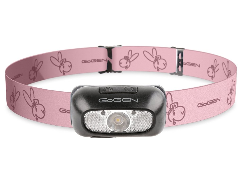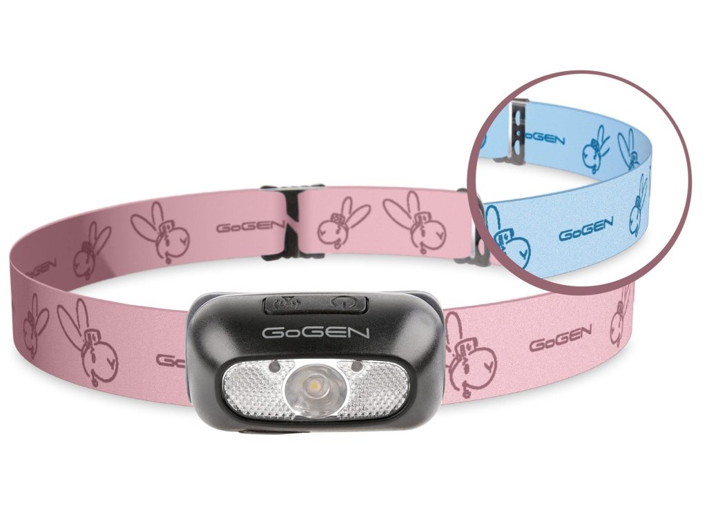 Balení obsahuje hned dva barevné pásky – modrý a růžový – takže si děti mohou vybrat podle nálady nebo vkusu. Díky jednoduchému systému výměny je možné vzhled čelovky snadno měnit.