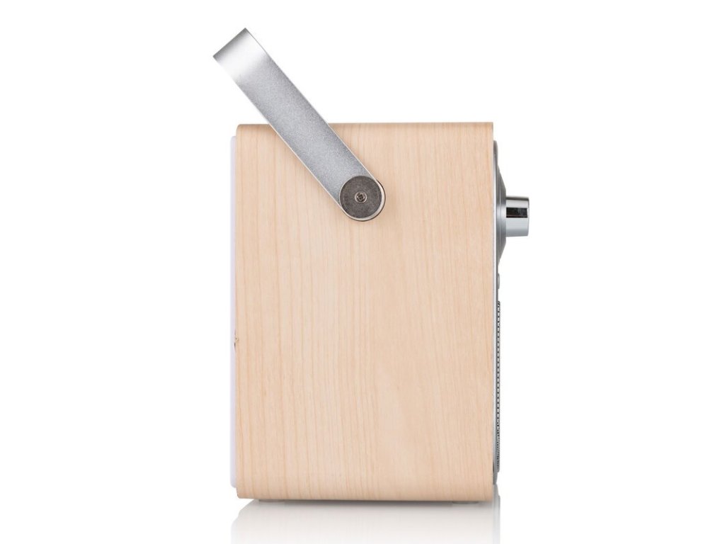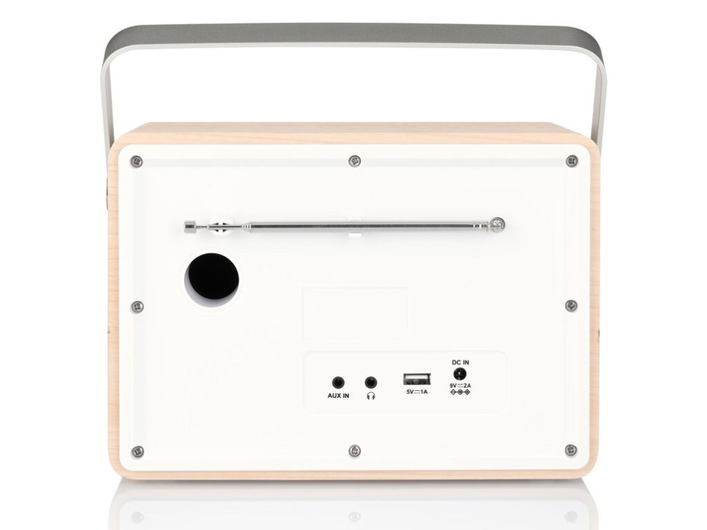 Stolní radiopřijímač s DAB+/FM tunerem, Bluetooth®, barevný LCD displej, USB nabíjecí port, sluchátkový výstup, AUX vstup, budík, dřevěný dekor/stříbrná barva