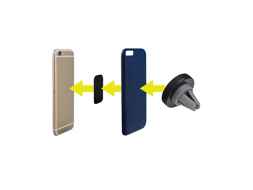 *Pro telefony vybavené zadním ochranným krytem: Mezi zadní ochranný kryt a telefon jednoduše vložíte jeden z protikusů / obdélníkovou destičku/, které je součástí balení. Přístroj poté jednoduše přichytíte na magnetický držák do jakékoli vámi zvolené polohy a úhlu.