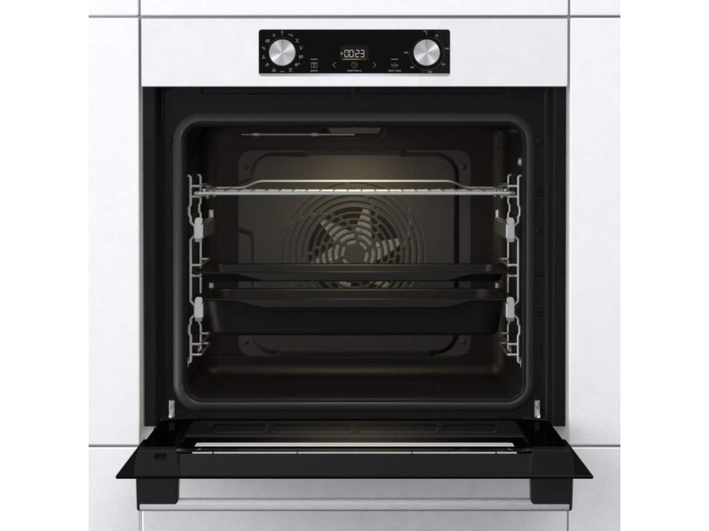 Vestavná trouba Gorenje BOS6737E09WG v bílém provedení má objem 77 litrů. HomeMade Plus tvar trouby je prostorný, napodobující tvar tradičních pecí na dřevo, což umožňuje optimální cirkulaci vzduchu. Ovládána je pomocí zasouvacích knoflíků doplněných Icon LED programovacími hodinami. Nabízí 11 funkcí pečení se snadnou manipulací plechu díky částečně vysouvací teleskopické liště na 2 úrovních. Nabízí pečení na více plechách současně, pečení v páře, ale také čištění trouby se realizuje pomocí páry AquaClean.