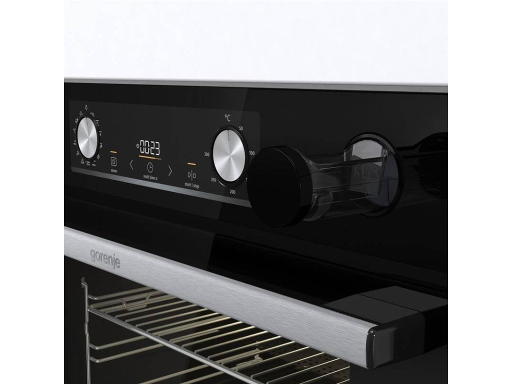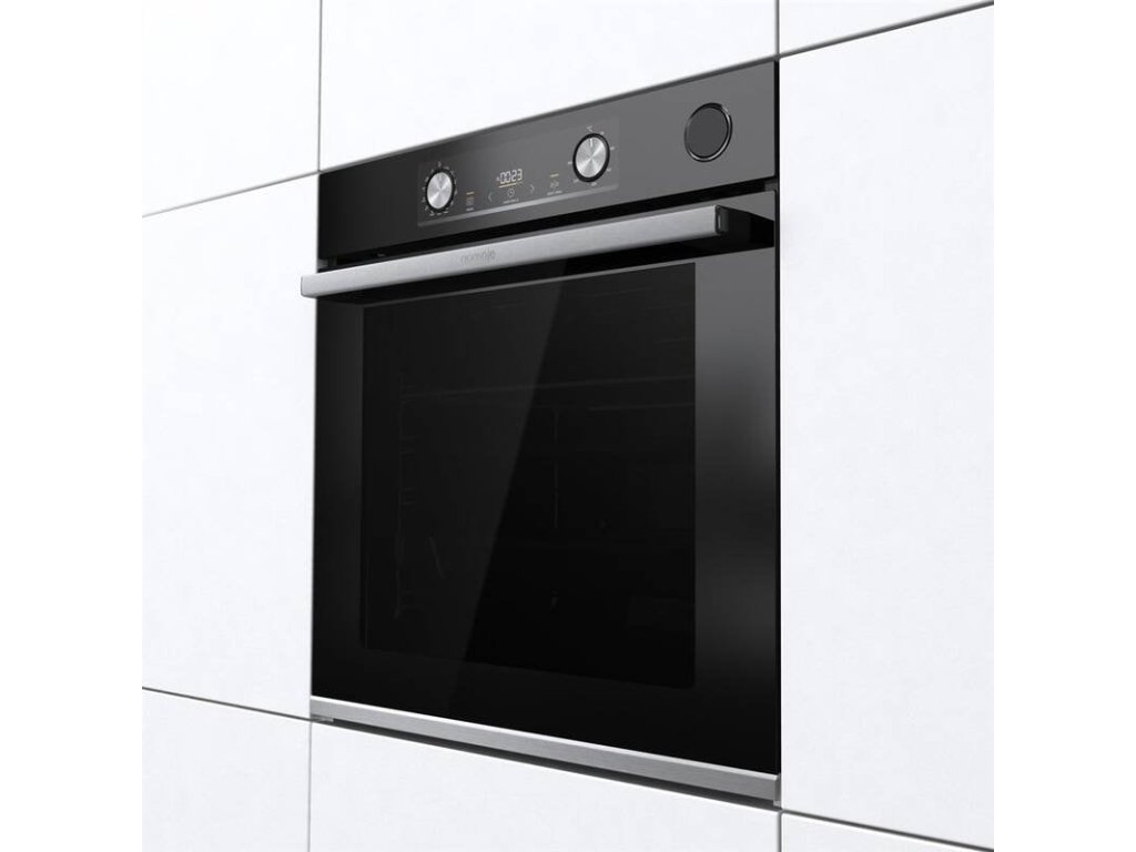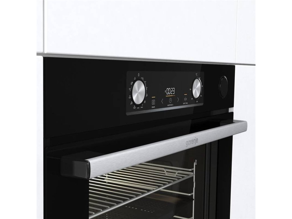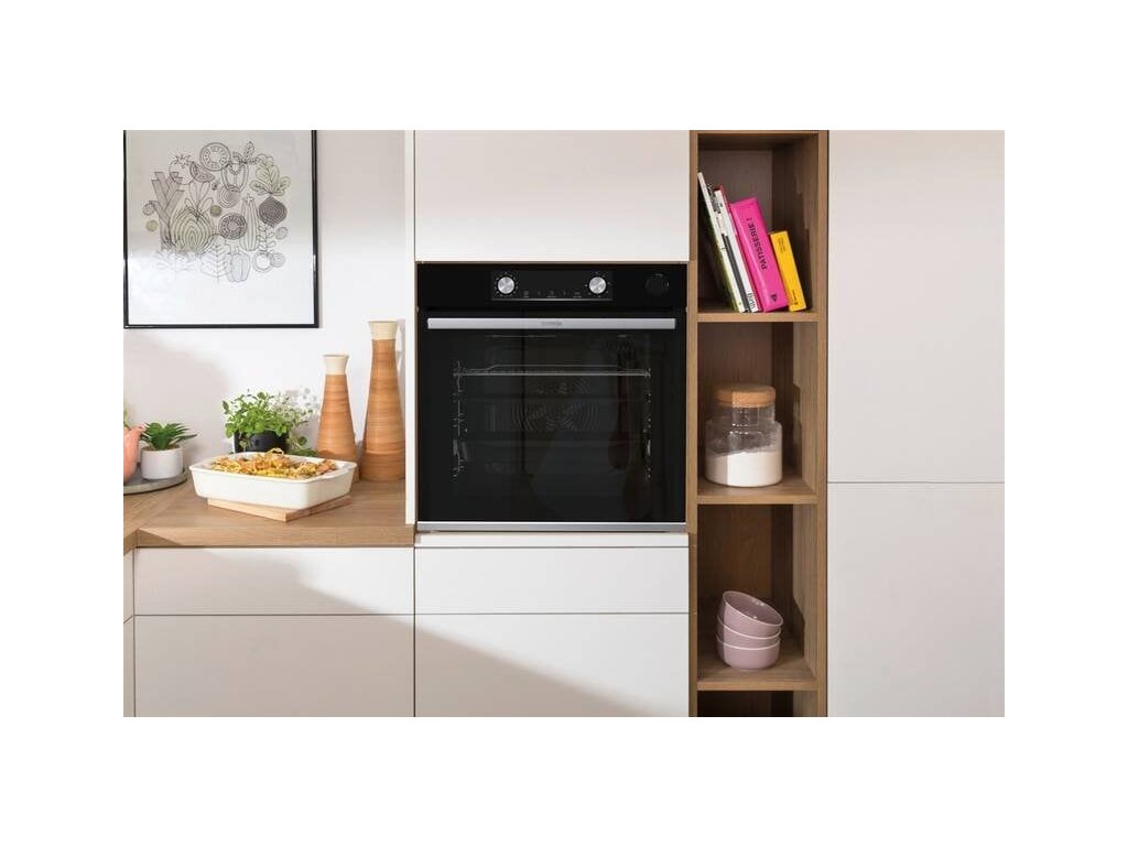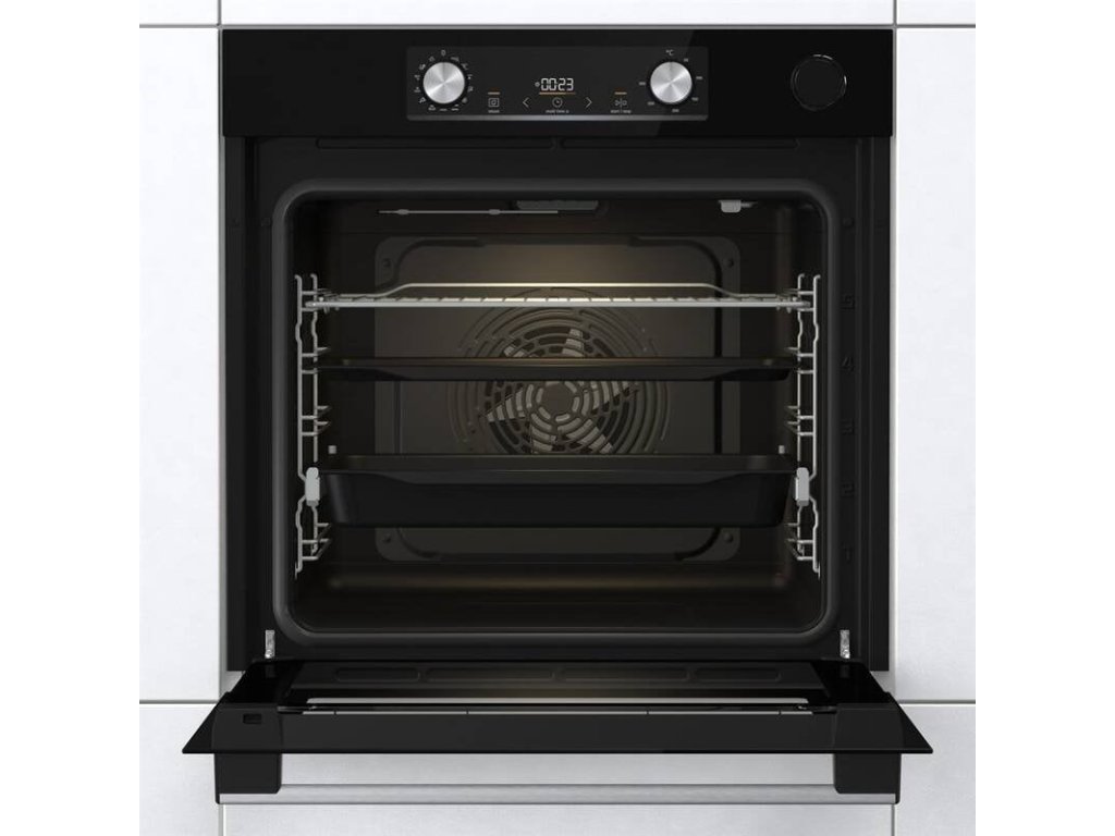 Máte rádi pečení? V tom případě by vás mohla zaujmout vestavná trouba Gorenje BSAX6737E08BG z modelové řady Essential Line. Tato horkovzdušná trouba s příkonem 3 500 W nabízí extra velkou pečicí kapacitu 77 litrů, kde si snadno a rychle připravíte své oblíbené pokrmy. Tato kapacita vám umožní péct velké porce jídel či péct na více plechách současně. Pro snadnou manipulaci s plechy se uvnitř nachází částečně výsuvné teleskopické lišty na jedné úrovni. Nechybí zde ani osvětlení ze stropu, zajišťující lepší přehled nad připravovanými potravinami. Tento model se pyšní úspornou energetickou třídou A, díky čemuž se nemusíte obávat vysokých účtů za energie. Dvířka mají dvojité zasklení a velmi tiché zavírání i otvírání.