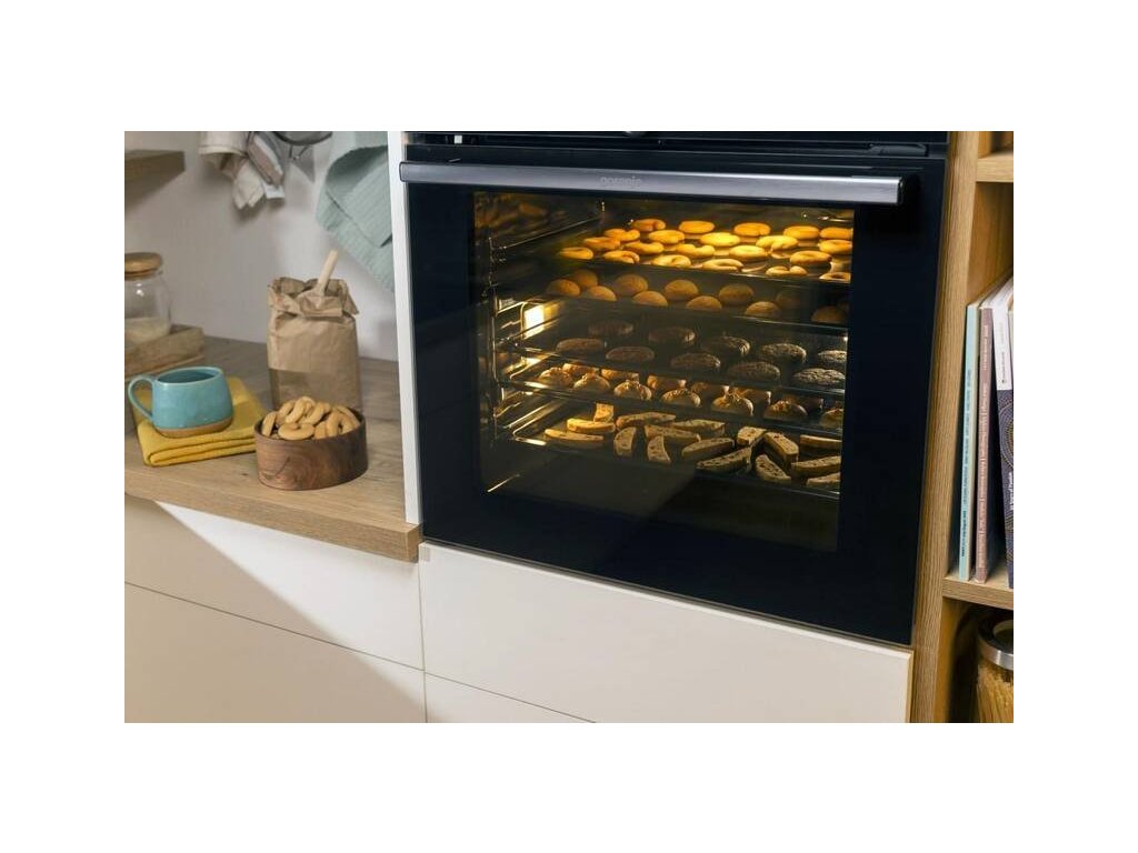 Trouba má obrovskou vnitřní kapacitu 77 l díky XXL prostoru pro pečení i velkých kusů. Inovativní zvětšení prostoru nabízí možnost využití celé šířky trouby. Vylepšené provedení zajistí rovnoměrné propečení na všech úrovních.